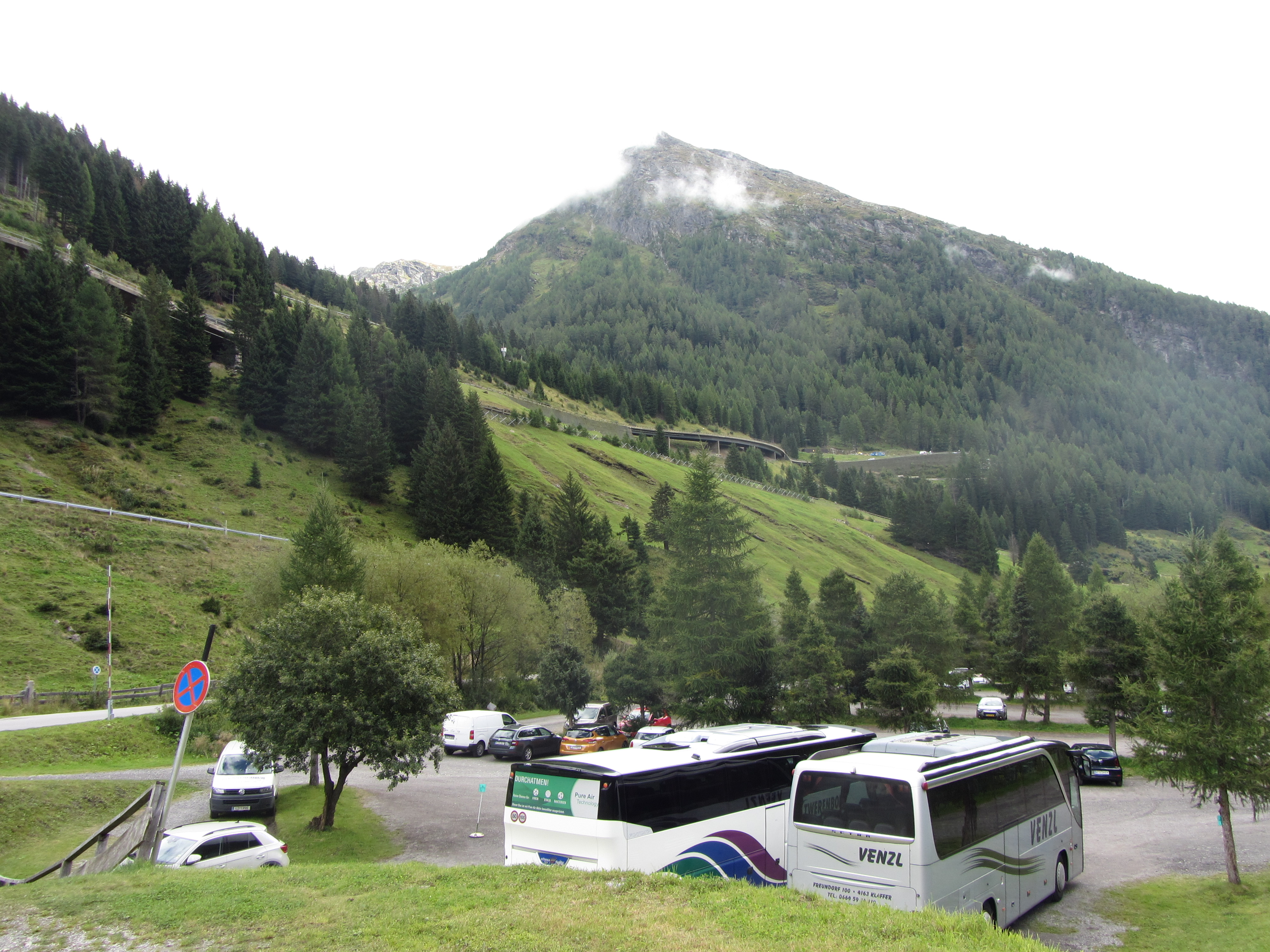 In Oberndorf was er door de laaghangende bewolking geen zicht op de Kitzbüheler Horn Ook de Wilder Kaiser zat in de wolken en de kabelbaan deed alsof-ie naar St. Johann ging Vlak voor de Felbertauerntunnel kwamen de wolken op ooghoogte Andere kant van de tunnel was het wat lichter Even de benen strekken door het Gschloßtal Wilde beesten veilig achter een stevig hek (en enthousiaste leren riem voor zo'n klein belletje) Het ansichtkaarten-uitzicht viel een beetje tegen door de wolken
