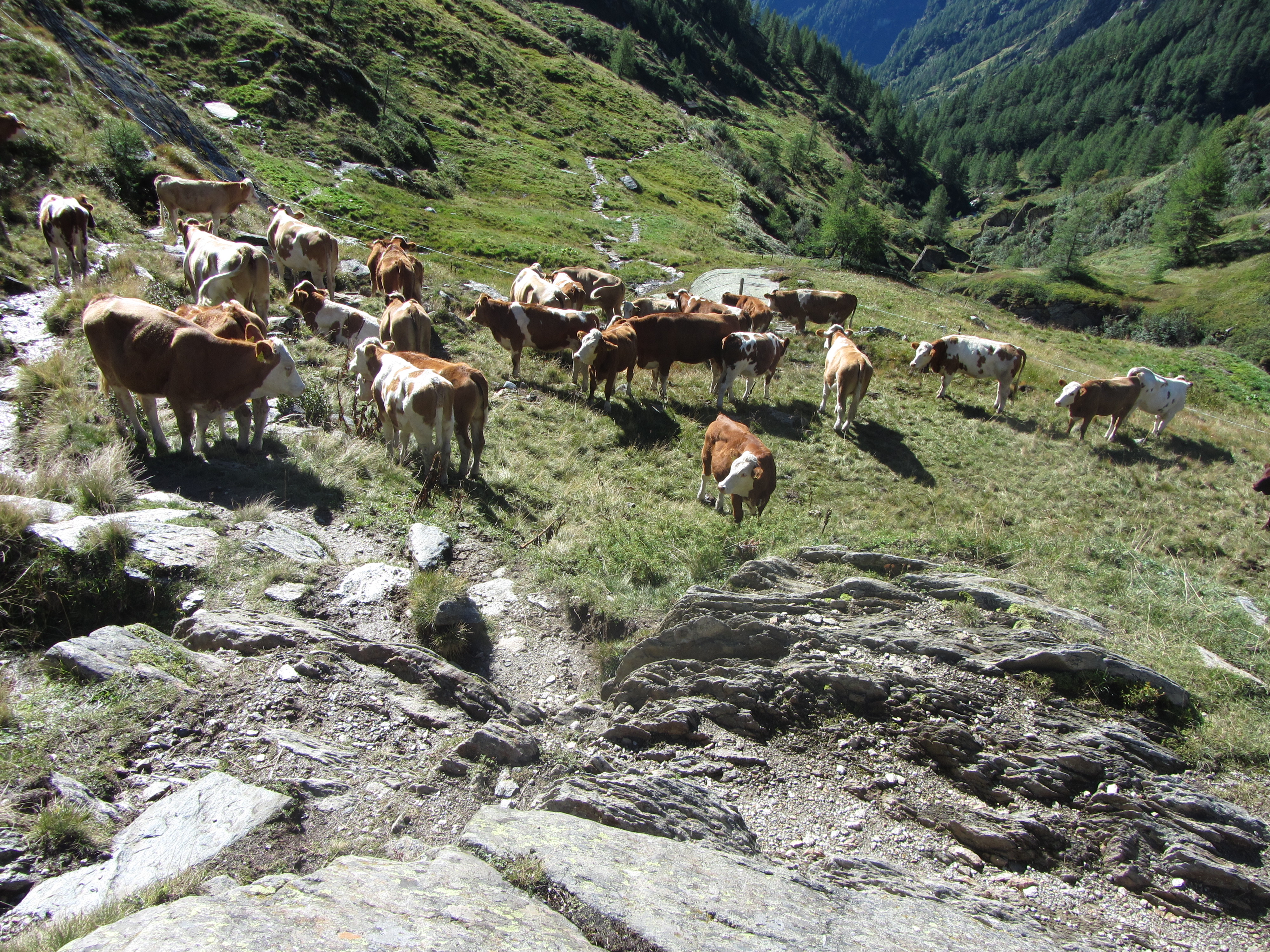 Dit jaar geen bier maar olie Rond de boomgrens blik richting zuiden Het zonnetje kwam boven de bergen uit en richting de hut werden steeds meer witte toppen zichtbaar Die koeien stonden behoorlijk in de weg Maar ze hadden wel een mooi uitzicht De hut kwam in beeld Zoek het (jonge) Murmeltier