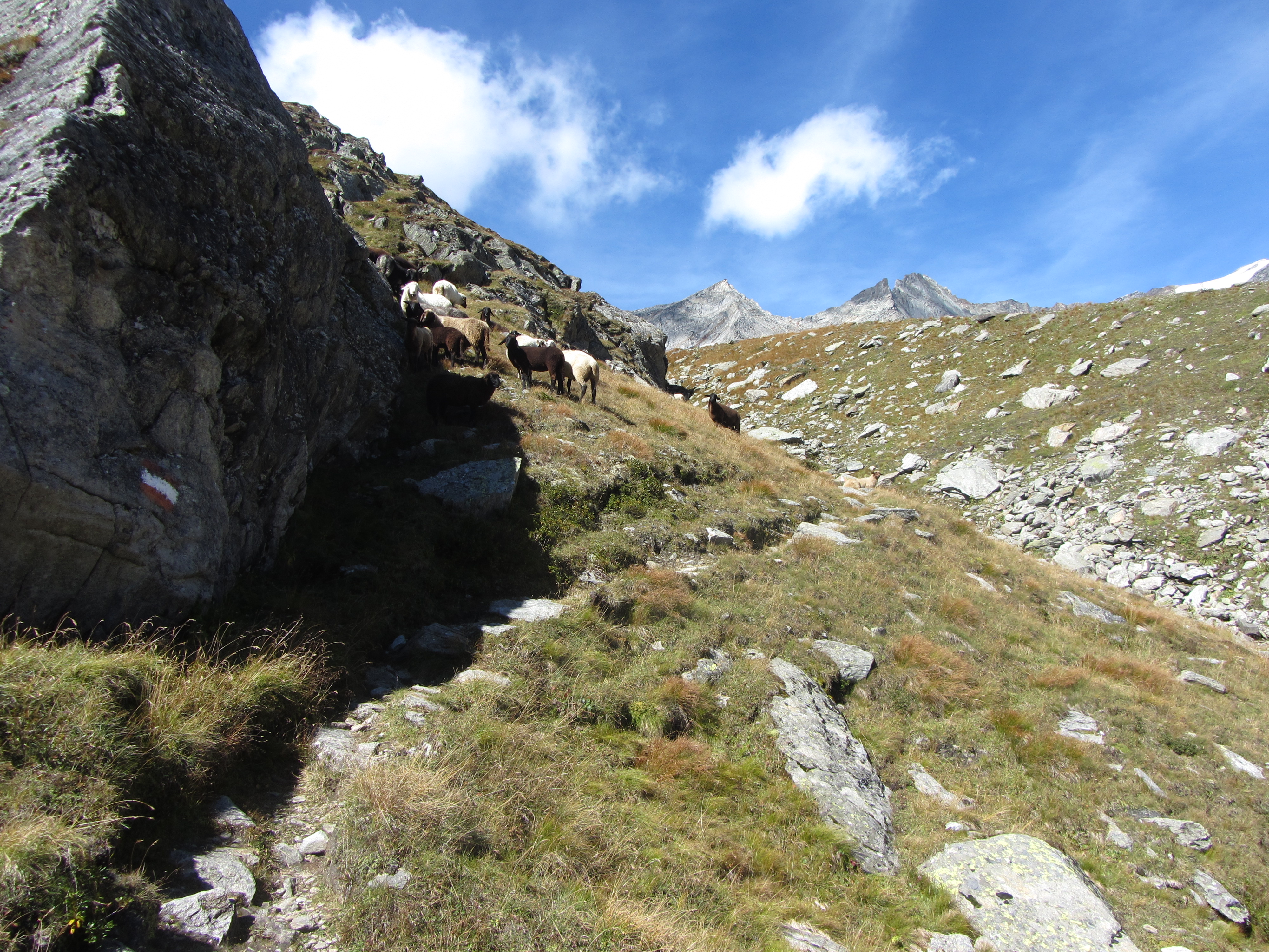 Zoek het (jonge) Murmeltier Bijna bij de hut Bij de hut kun je allerlei kanten op; deze keer naar de Rostocker Eck via de Direktanstieg via de noordkant Nog meer wilde dieren Op de Kreuzspitze was wat verse sneeuw van het slechte weer van gisteren te zien Het uitzicht over het Maurertal werd ook steeds weidser De Simonysee, Simonykees en Simonyspitzen