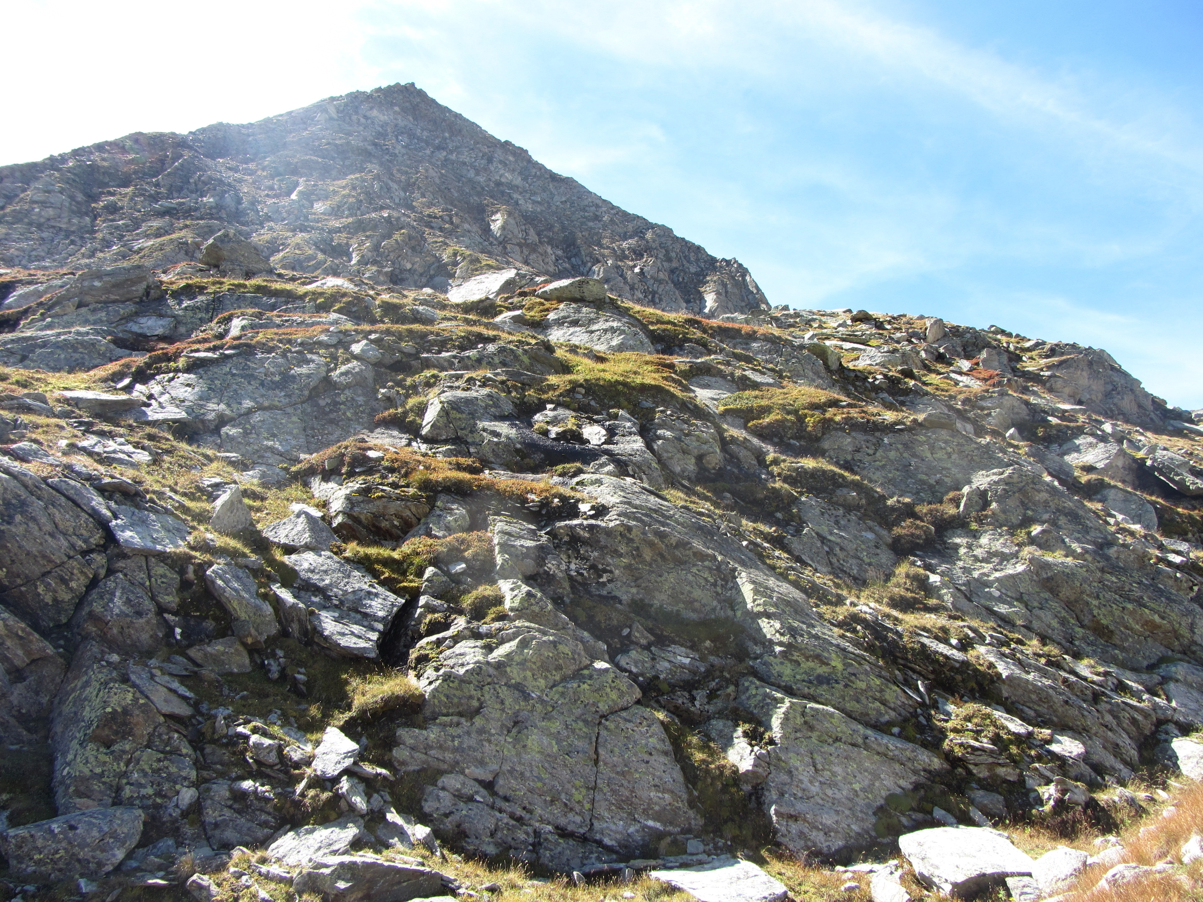 Op de Kreuzspitze was wat verse sneeuw van het slechte weer van gisteren te zien Het uitzicht over het Maurertal werd ook steeds weidser De Simonysee, Simonykees en Simonyspitzen De top kwam steeds dichterbij Het pad ging recht op een groep vogels af Hier zijn ze wat beter te zien De Malhamkees kwam ook in beeld, achter een rotsige wand