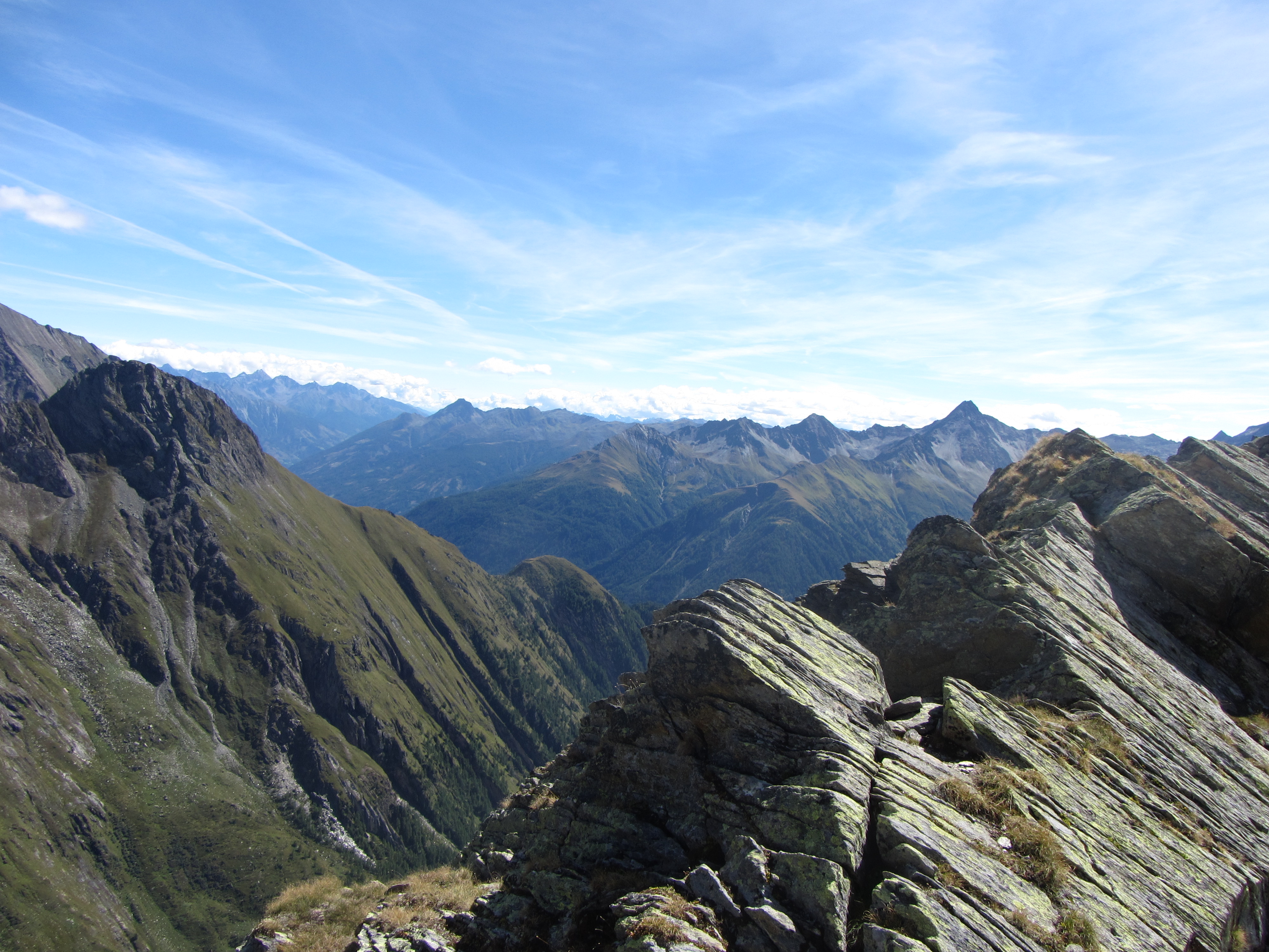 Op de top Richting noorden. De Groß Venediger blijft verstopt achter de Großer Happ. Het pad door het dal naar de hut was goed te zien Richting zuidoosten. Het Virgental ligt in de diepte. Richting zuiden Riching zuidwesten. De terugweg loopt ergens beneden in dit dal maar is niet goed te zien De rotsige wand van een paar foto's terug ziet er van boven af veel minder indrukwekkend uit