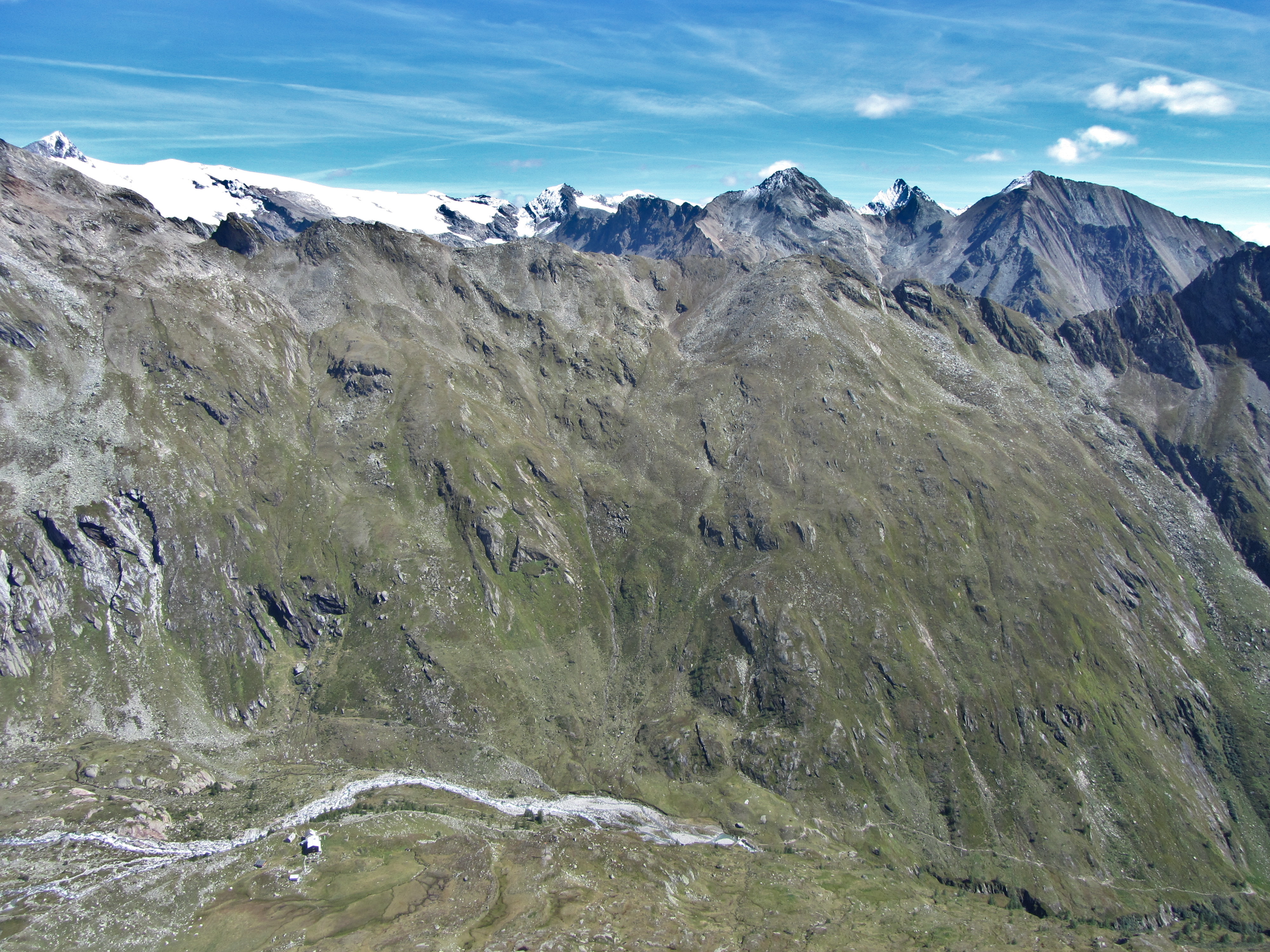 Naar het oosten toe kwamen nog wat vers besneeuwde toppen tevoorschijn Op de top Richting noorden. De Groß Venediger blijft verstopt achter de Großer Happ. Het pad door het dal naar de hut was goed te zien Richting zuidoosten. Het Virgental ligt in de diepte. Richting zuiden Riching zuidwesten. De terugweg loopt ergens beneden in dit dal maar is niet goed te zien