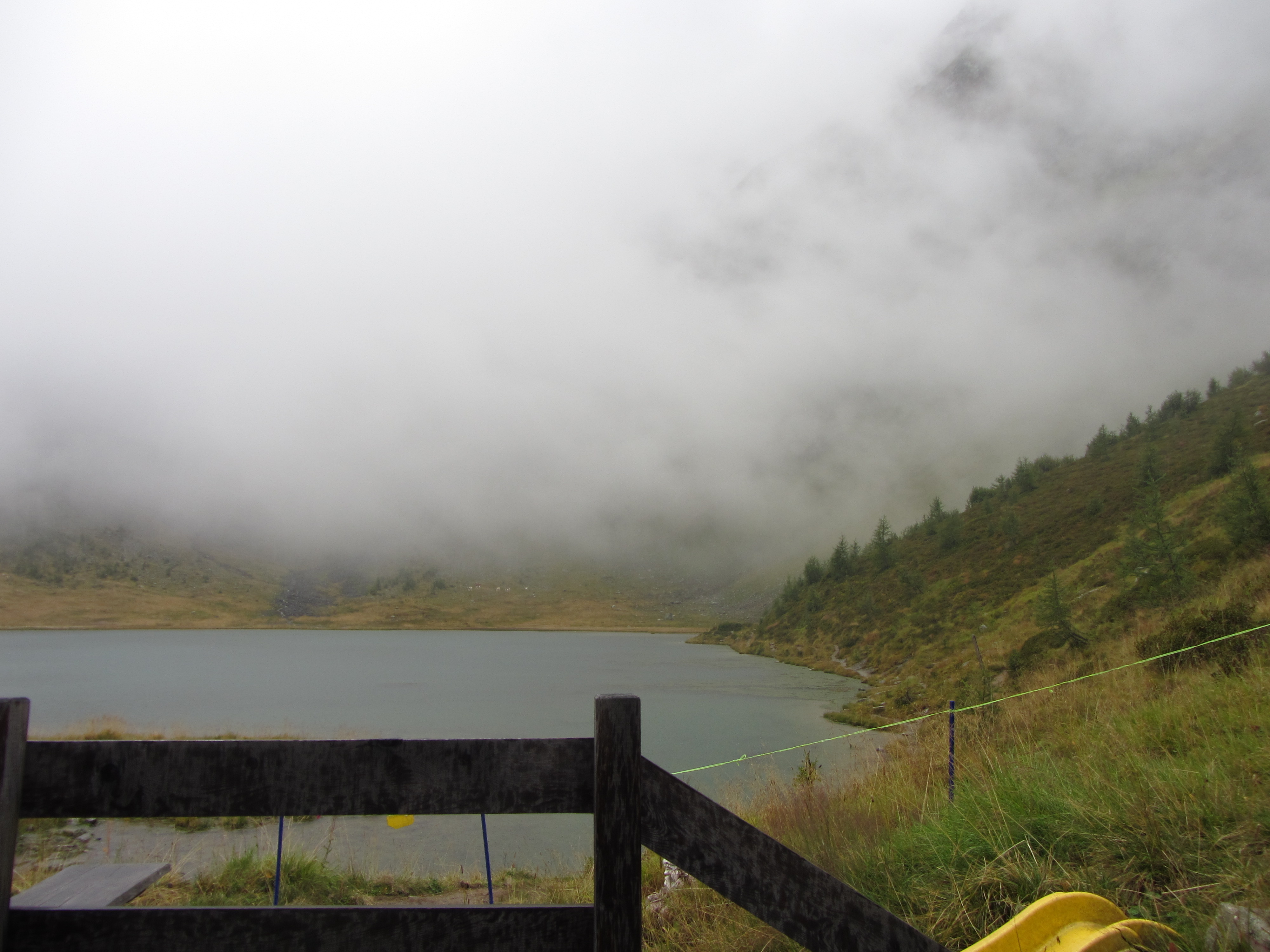 Keuzemoment bij het Wetterkreuz. Toch maar niet richting Berger Kogel maar naar de Bergerseehütte Goede keuze; een paar minuten later vielen er wat druppels De Bergerseehütte op zijn schitterende locatie Veilig op het terras kwam er een dikke bui langs Na de bui gauw weer naar beneden. Het grasveld bij het Wetterkreuz was tussen te wolken te zien De Berger Kogel kwam nog even uit de wolken tevoorschijn De hut was inmiddels weer verdwenen in de volgende bui maar hier was het nog droog