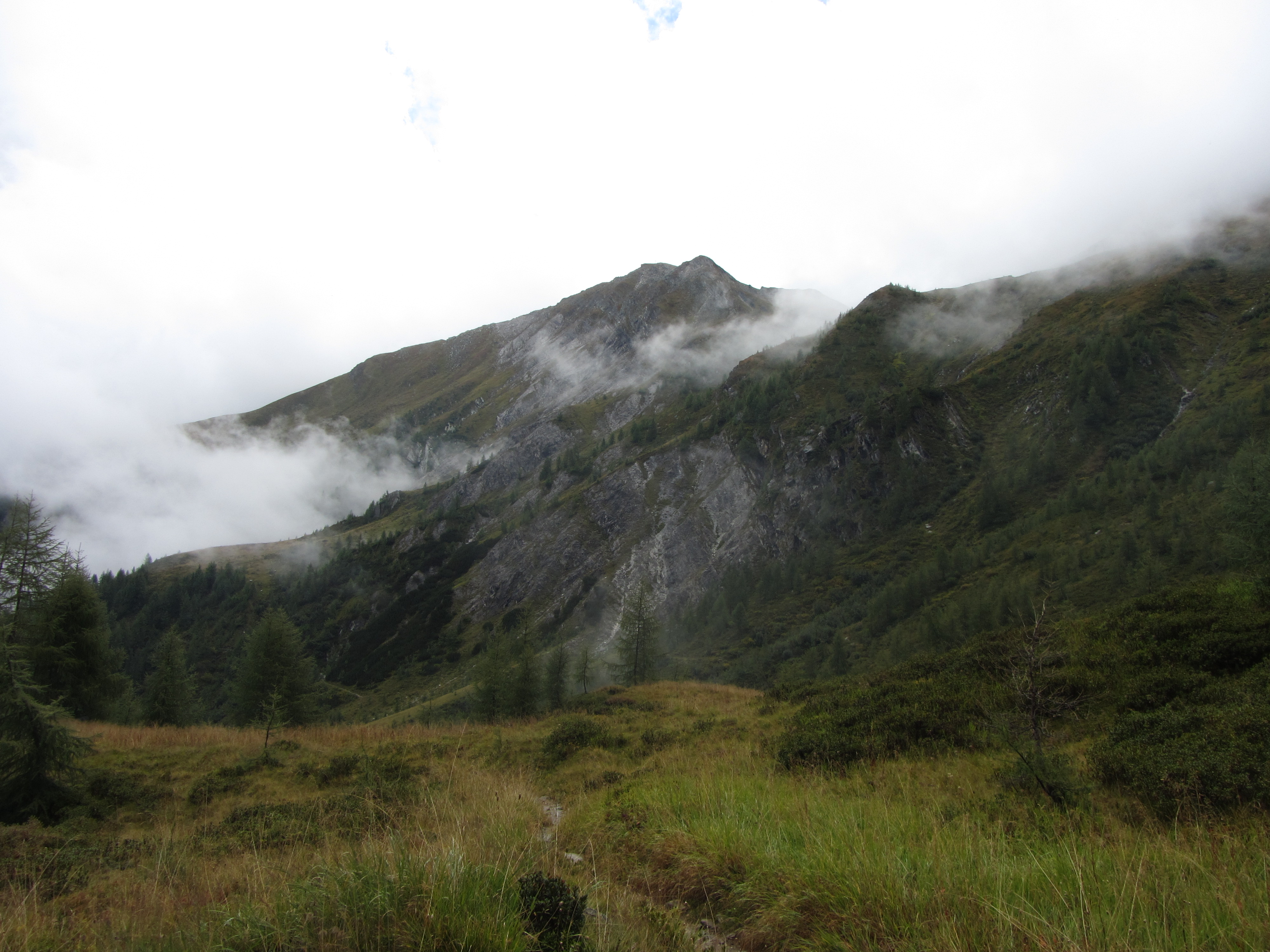 De Bergerseehütte op zijn schitterende locatie Veilig op het terras kwam er een dikke bui langs Na de bui gauw weer naar beneden. Het grasveld bij het Wetterkreuz was tussen te wolken te zien De Berger Kogel kwam nog even uit de wolken tevoorschijn De hut was inmiddels weer verdwenen in de volgende bui maar hier was het nog droog Wild beest midden op het pad Alles bij elkaar toch zeker wel anderhalve meter lang schat ik