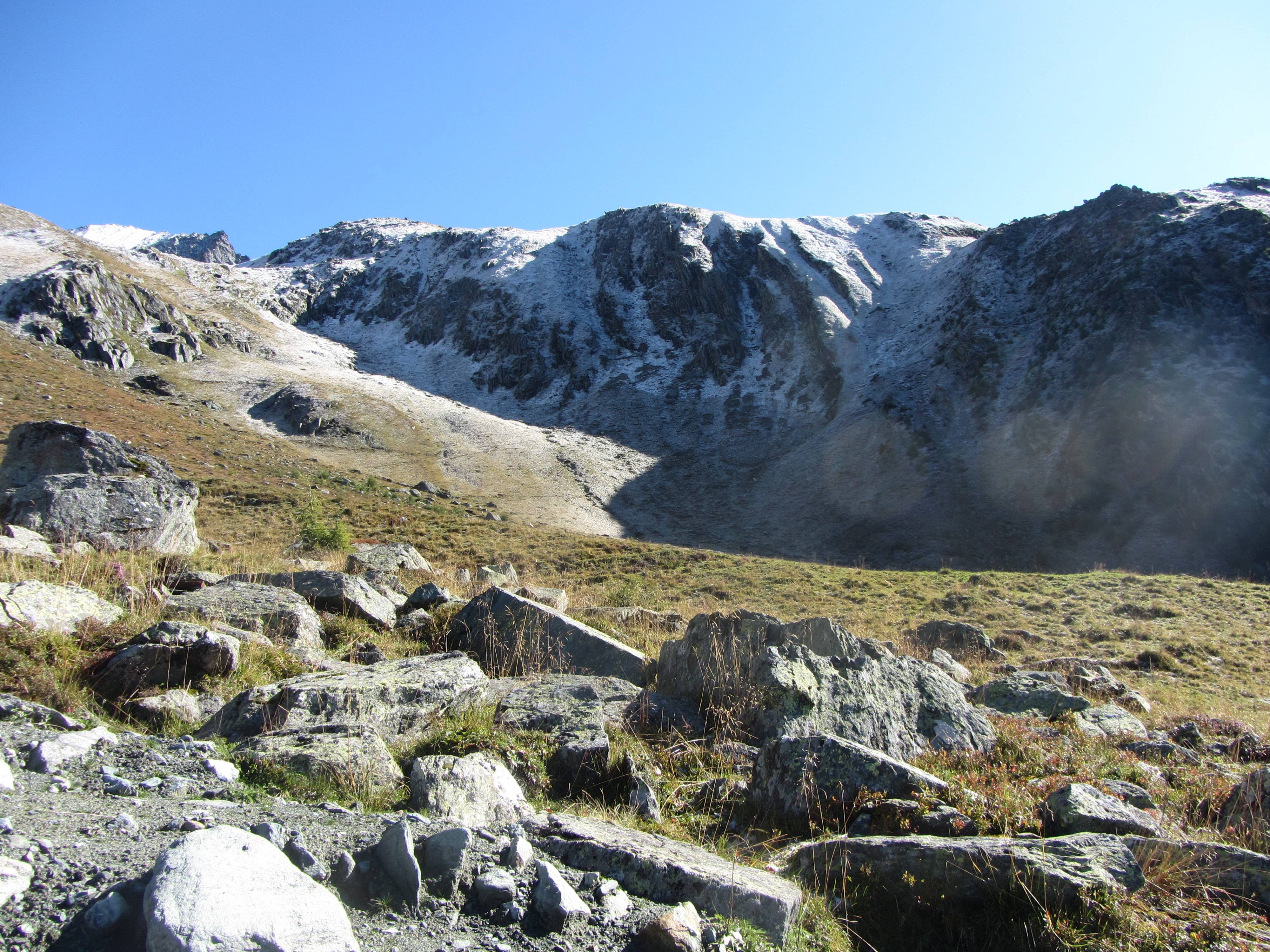 Boven de boomgrens op de Wunalm. De schaduwkant van de Eselsrücken is ook nog wit.