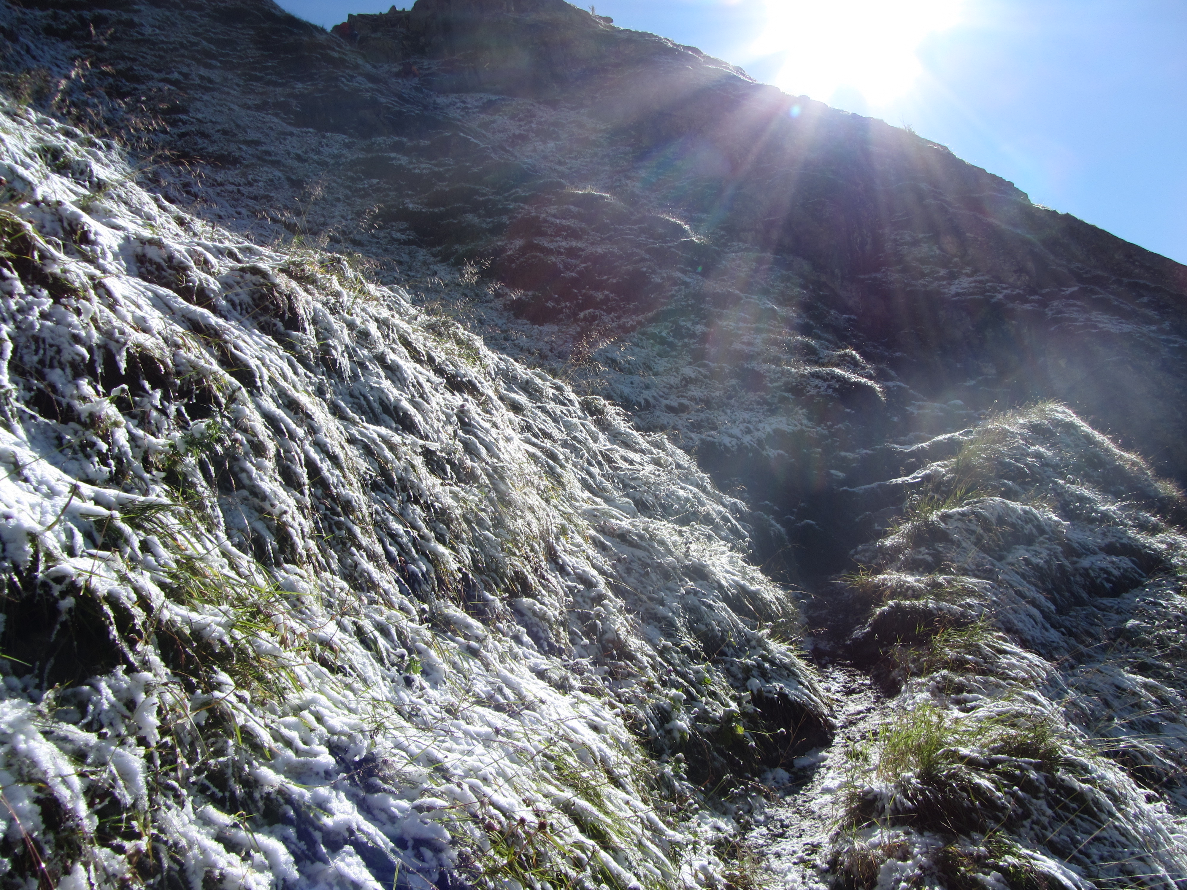 Ook richting Lasörling is de sneeuw flink aan het smelten Zowaar nog twee mensen gespot Geheel per ongeluk een Artsy Fartsy Live Laugh Love-foto gemaakt De meeste sneeuw lag op het gras en niet op het pad Er waren jagers op wolvenjacht (beweerden ze) maar ze hadden alleen maar twee Murmeltiere geschoten Het pad over de Eselsrücken liep verrassend ver omhoog Maar liefst vier mensen gespot (die twee van eerder plus twee verse bejaarden)