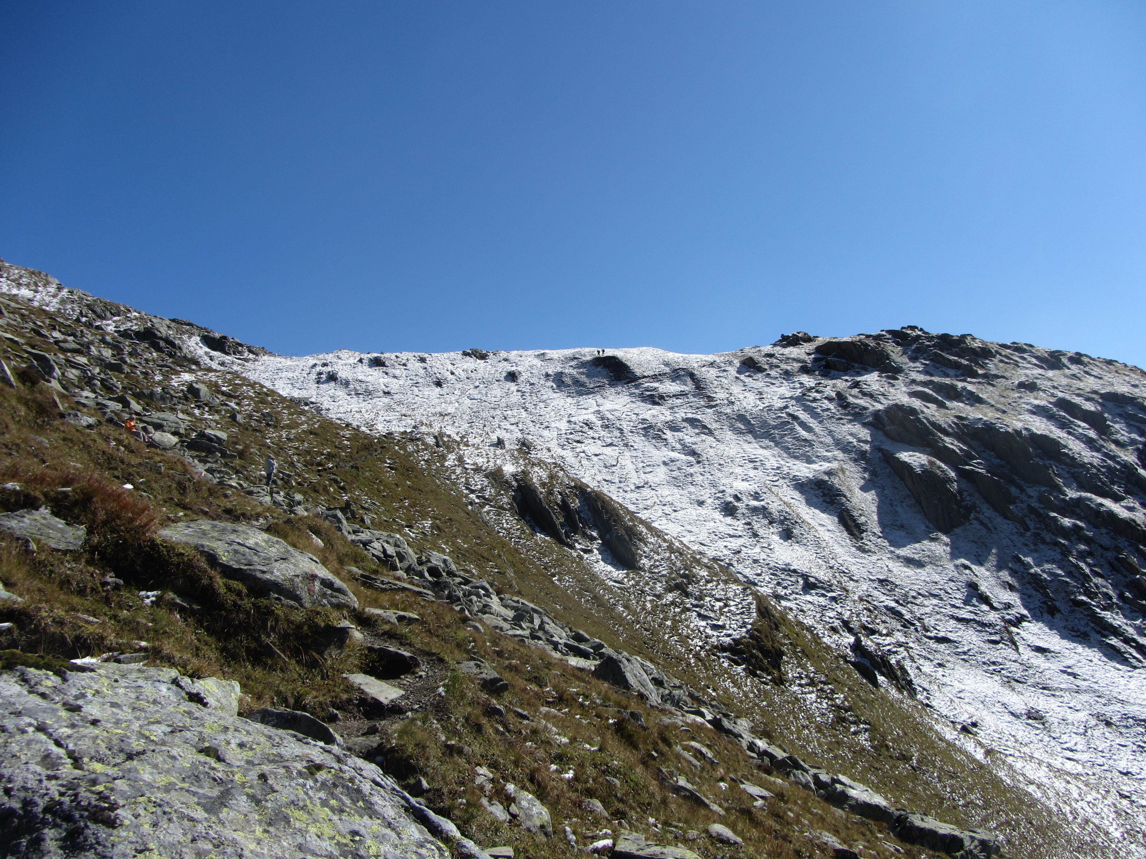 De meeste sneeuw lag op het gras en niet op het pad Er waren jagers op wolvenjacht (beweerden ze) maar ze hadden alleen maar twee Murmeltiere geschoten Het pad over de Eselsrücken liep verrassend ver omhoog Maar liefst vier mensen gespot (die twee van eerder plus twee verse bejaarden) Bijna bovenaan de Eselsrücken Opeens weer veel meer uitzicht De Bonn Matreier Hütte in de sneeuw in het zonnetje