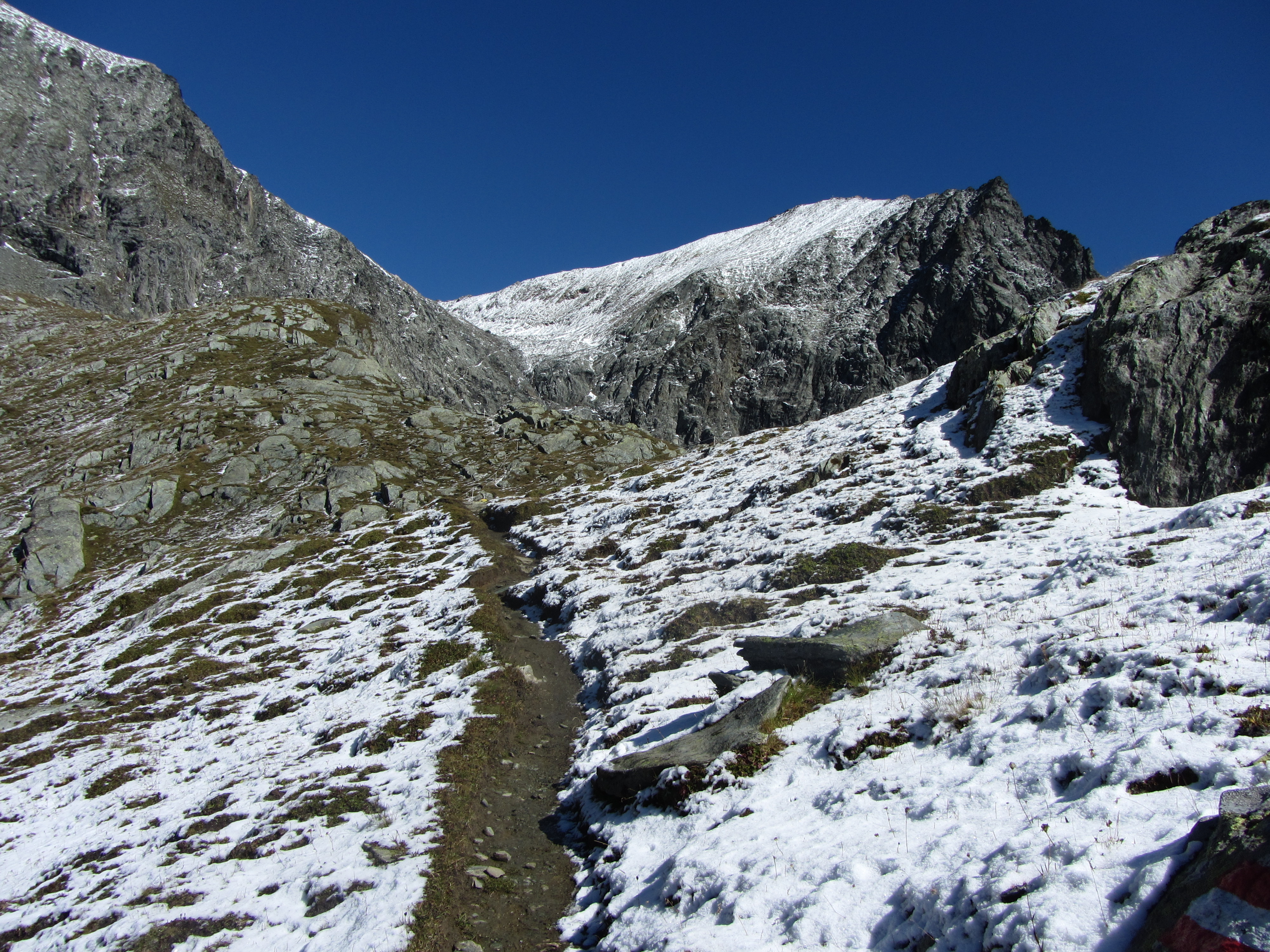 Er waren jagers op wolvenjacht (beweerden ze) maar ze hadden alleen maar twee Murmeltiere geschoten Het pad over de Eselsrücken liep verrassend ver omhoog Maar liefst vier mensen gespot (die twee van eerder plus twee verse bejaarden) Bijna bovenaan de Eselsrücken Opeens weer veel meer uitzicht De Bonn Matreier Hütte in de sneeuw in het zonnetje De sneeuw rond de Zupalsee is al grotendeels verdwenen