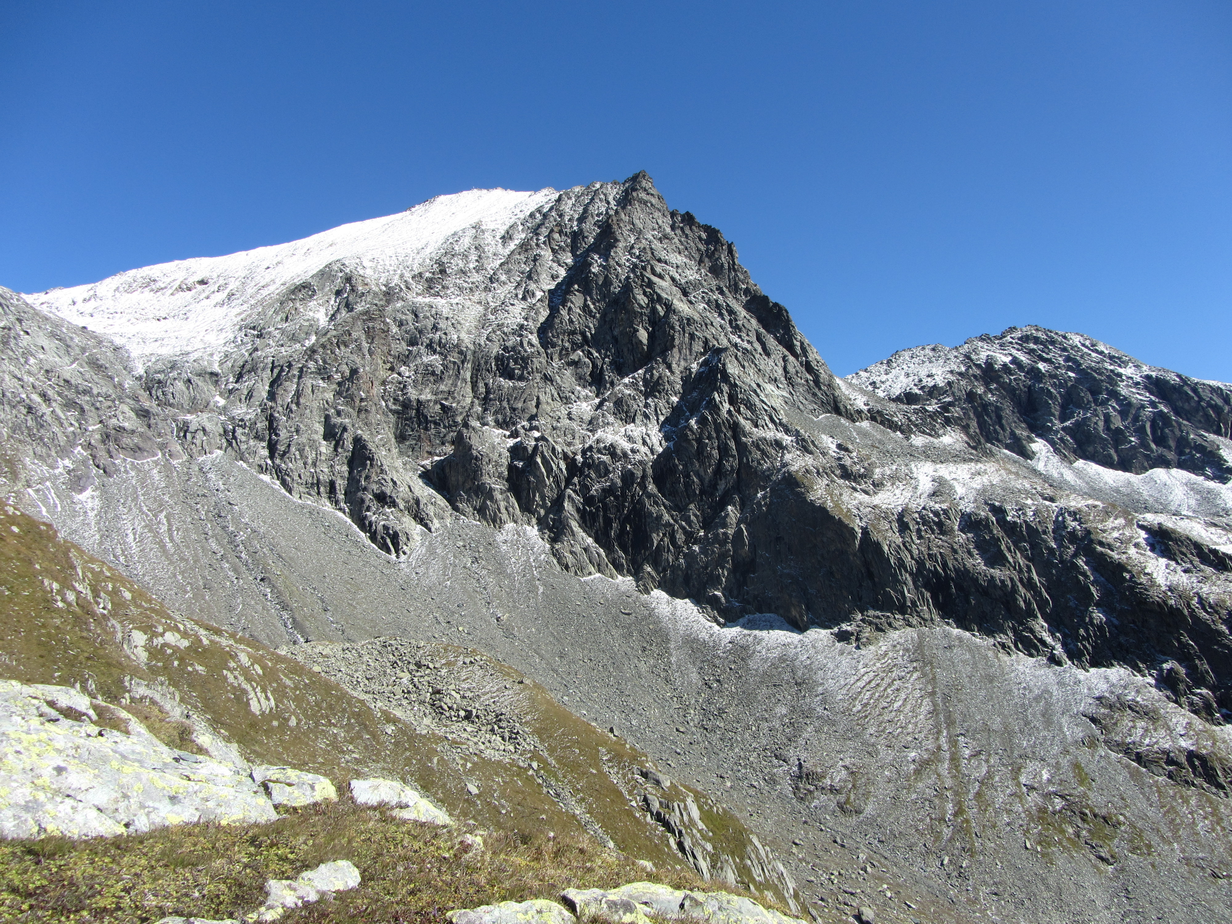 Het pad over de Eselsrücken liep verrassend ver omhoog Maar liefst vier mensen gespot (die twee van eerder plus twee verse bejaarden) Bijna bovenaan de Eselsrücken Opeens weer veel meer uitzicht De Bonn Matreier Hütte in de sneeuw in het zonnetje De sneeuw rond de Zupalsee is al grotendeels verdwenen Het pad was van bovenaf erg goed zichtbaar