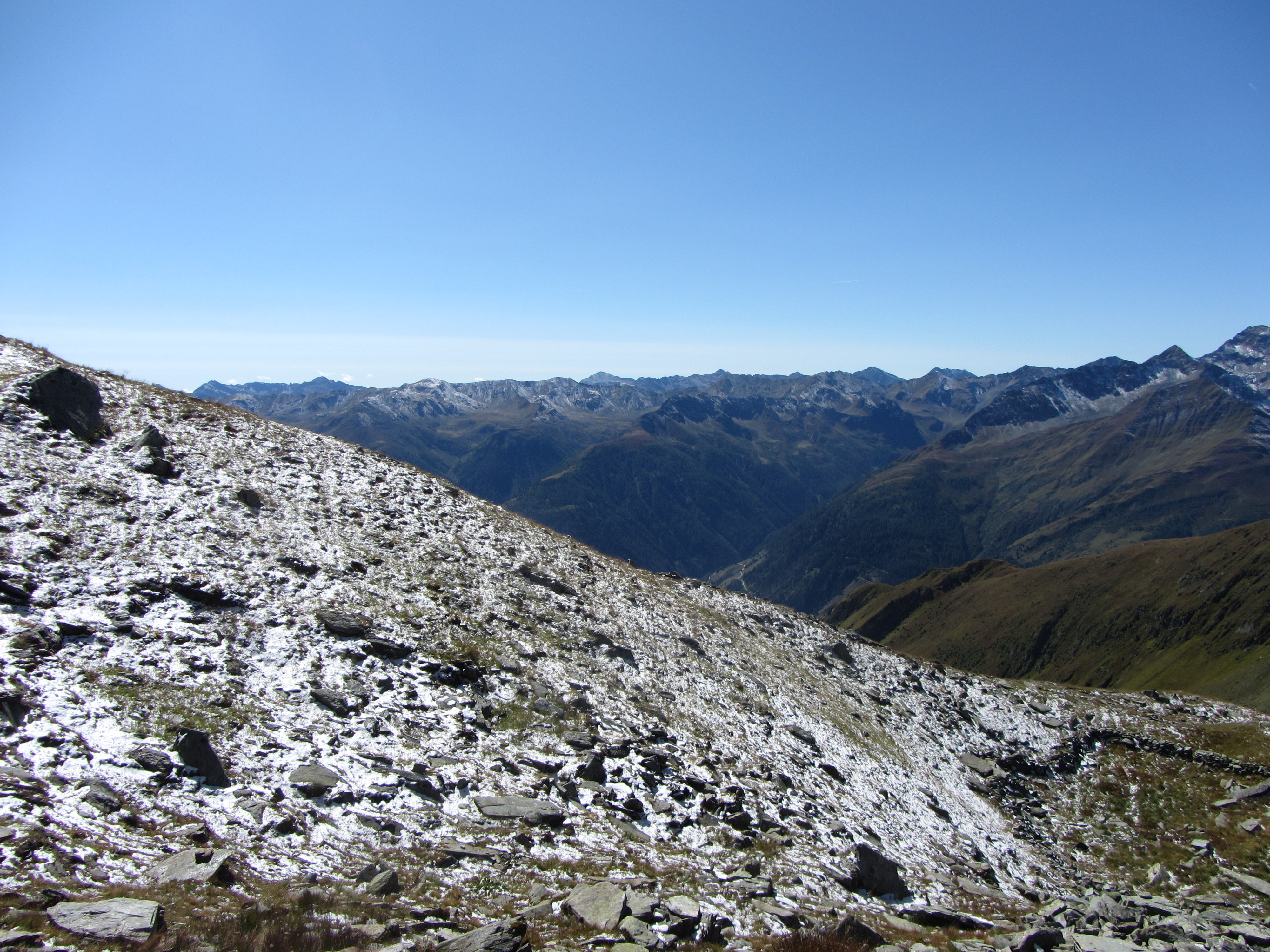 Het pad was van bovenaf erg goed zichtbaar Uitzicht naar het zuidwesten Aan de andere kant ging het heel steil zigzag naar beneden De sneeuw was hard aan het wegdooien Terugkijkend was het steile zigzagstukje mooi te zien Bij de Bonn Matreier Hütte De Rauhkopf en het pad over de graat incl mensen