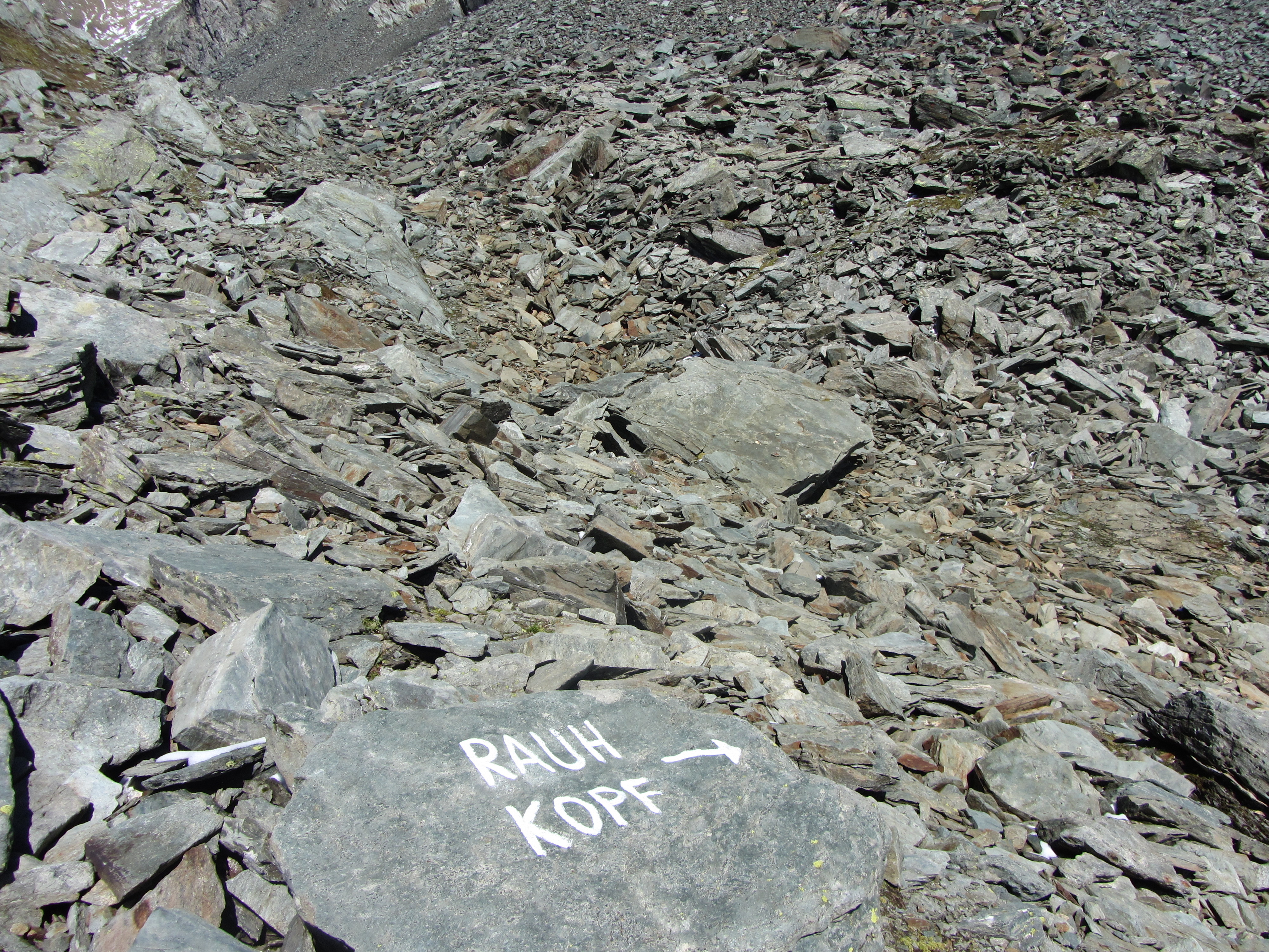 De Rauhkopf en het pad over de graat incl mensen Ze zijn niet heel creatief met wegnummers Er lagen wat steentjes op het pad Die kant op dus Opeens dook de Groß Glockner op De dame met de pet van het terras was een handige verkenner, maar eigenlijk ging het vooral recht omhoog Vanaf de rand nieuw uitzicht over een stuk van het lege lege Frosnitztal