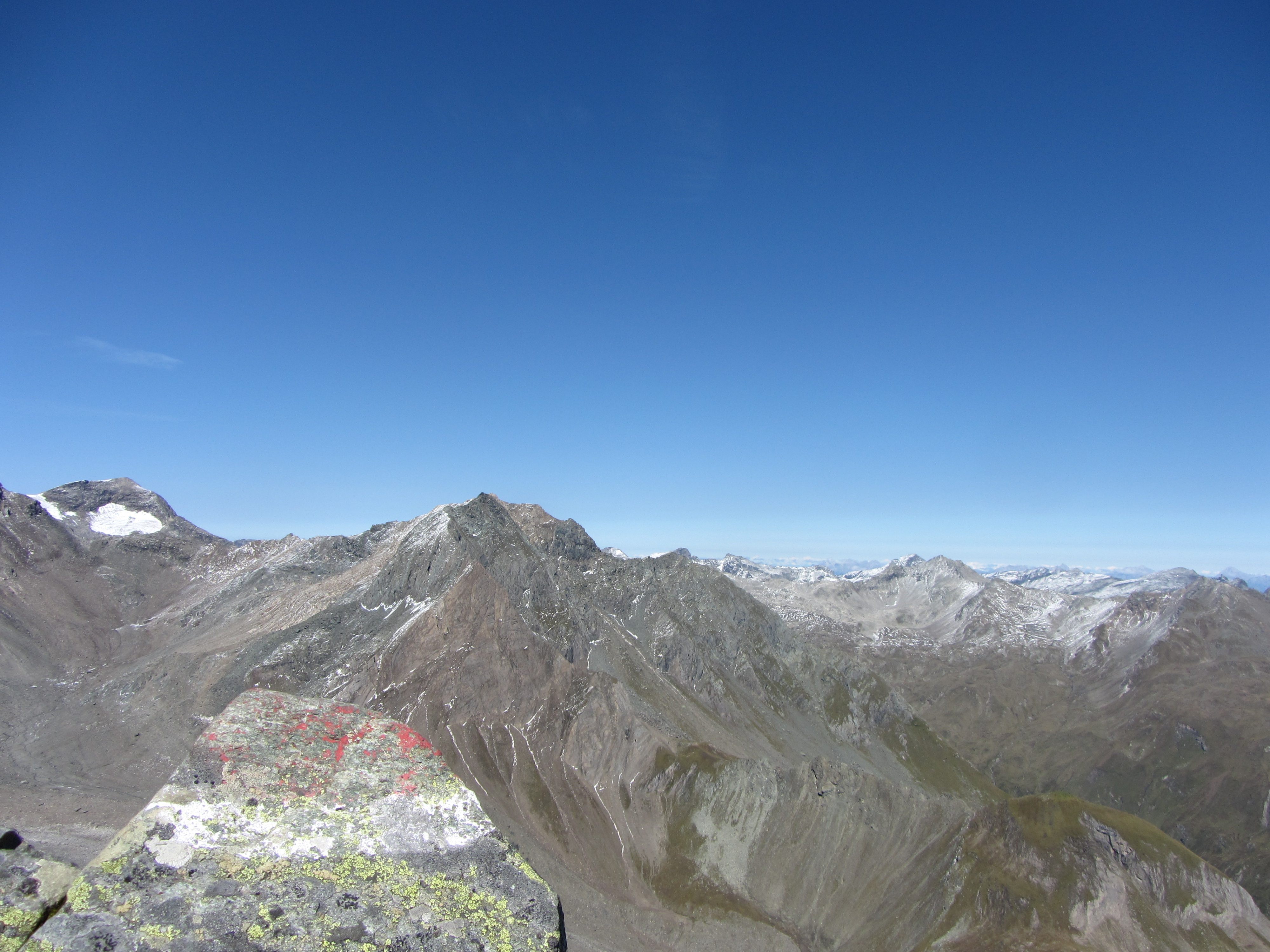 De dame met de pet van het terras was een handige verkenner, maar eigenlijk ging het vooral recht omhoog Vanaf de rand nieuw uitzicht over een stuk van het lege lege Frosnitztal Het gipfelkreuz was niet heel indrukwekkend maar het deed waarvoor het gemaakt was Uitzicht naar het noorden (nog veel meer leeg leeg Frosnitztal) Richting oosten 1800m in de diepte lag het Virgental Er waren ook allerlei Dolomiten te zien, zelfs een van de beroemdste
