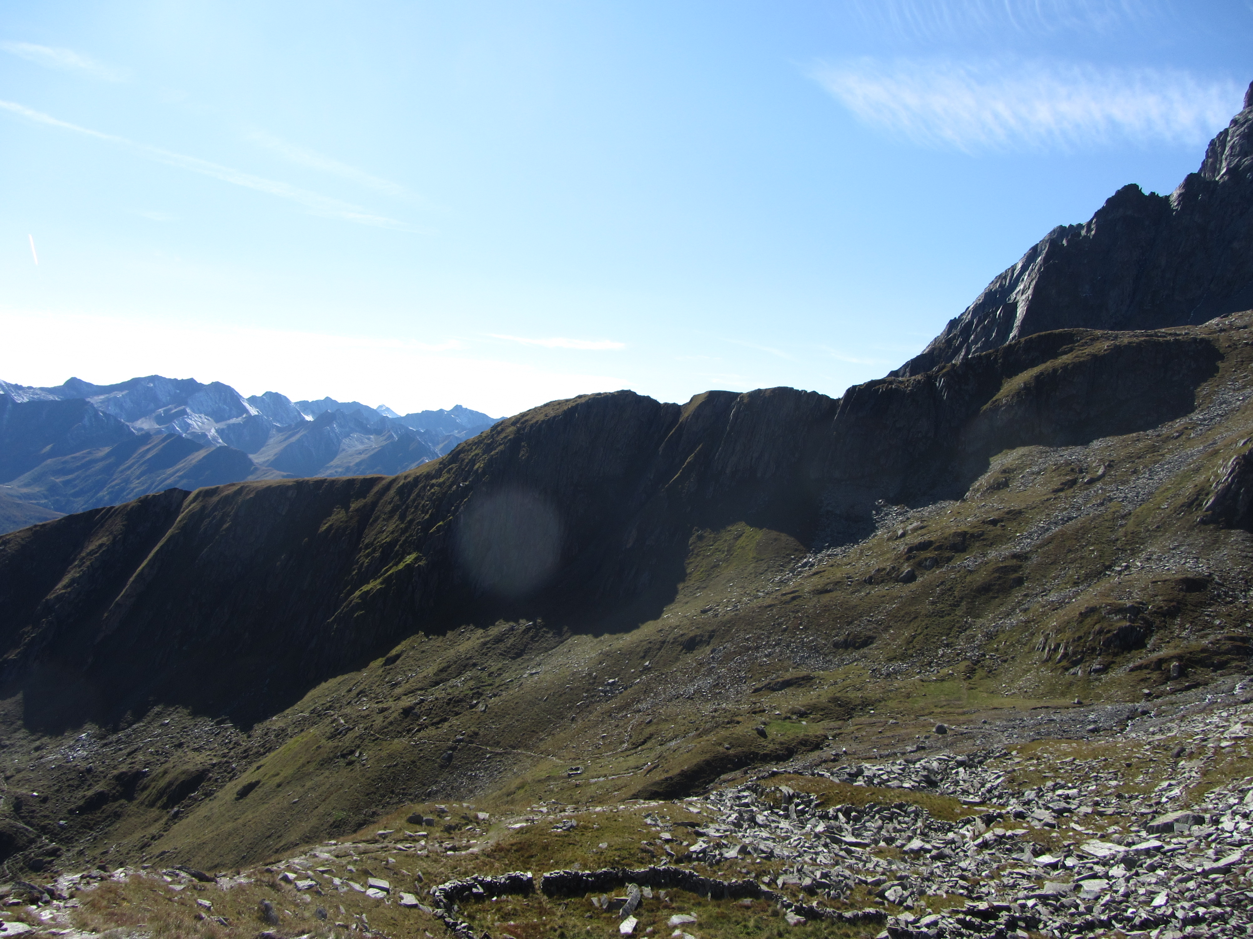 Op de terugweg nog wat mensen vlakbij de top gespot Alweer voorbij de hut Over de grote brede weg via de Nilljochhütte terug Nu lag deze kant van de Eselsrücken in de schaduw Evenwichtsbalk met hindernissen Ook hier zit weer een Murmeltier goed verdekt verstopt Hier is-ie wat makkelijker te vinden