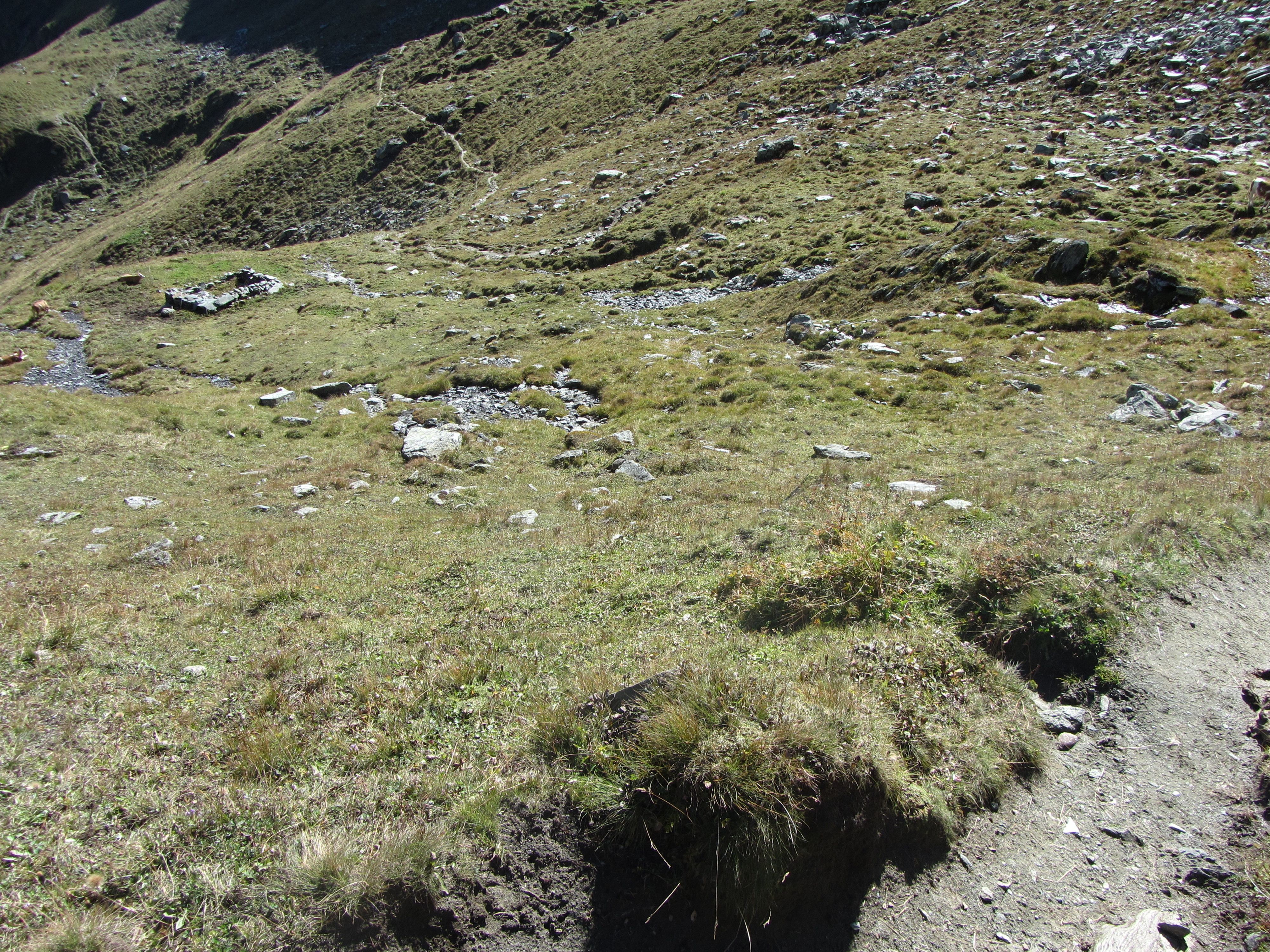 Over de grote brede weg via de Nilljochhütte terug Nu lag deze kant van de Eselsrücken in de schaduw Evenwichtsbalk met hindernissen Ook hier zit weer een Murmeltier goed verdekt verstopt Hier is-ie wat makkelijker te vinden Even later kwam er nog een tweede kijken Blik terug