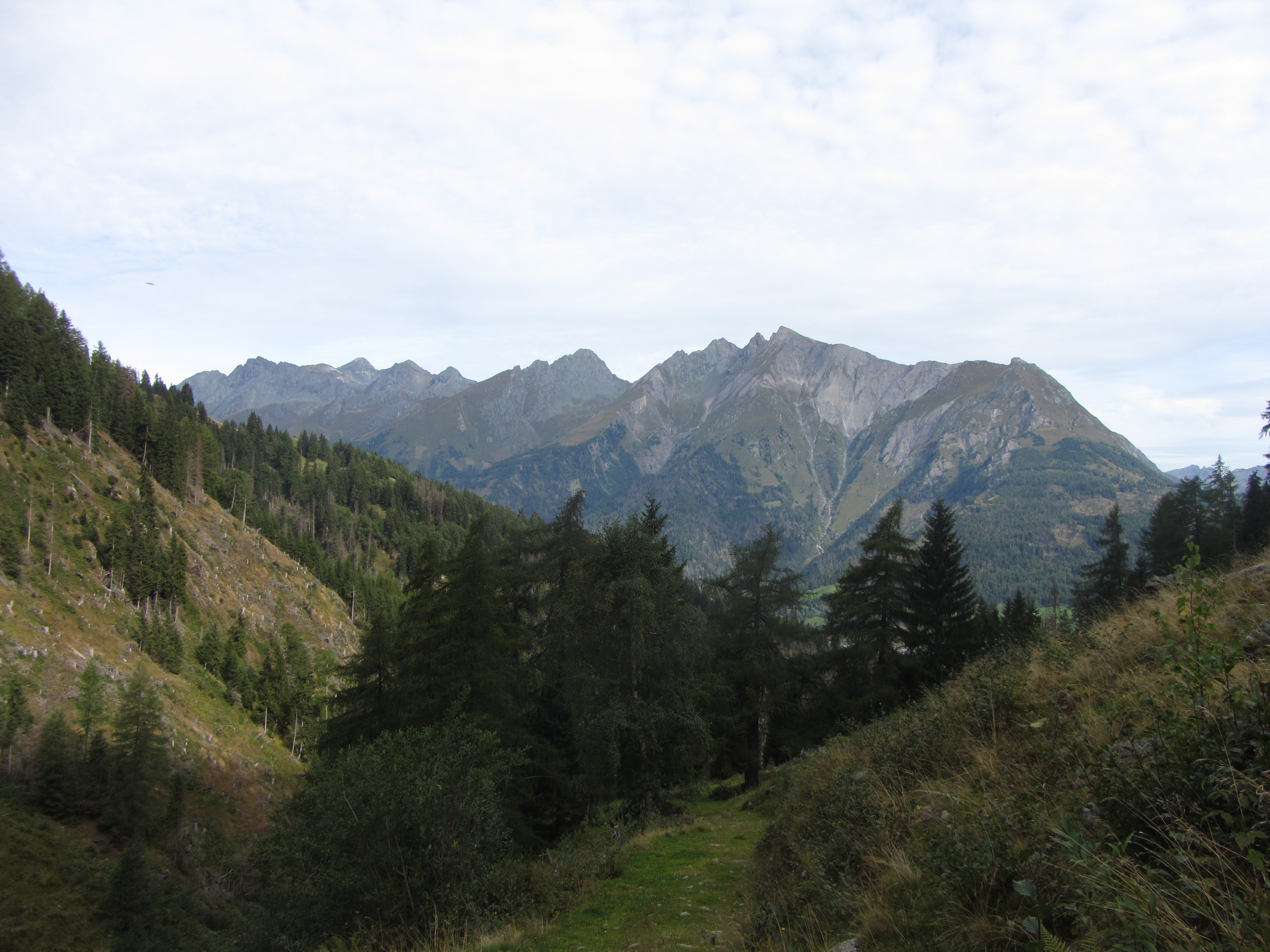 De Großer Zunig had nog wat sneeuw op z'n noordkant De Nilljochhütte van gisteren was te zien boven Virgen Door het Arnitztal Vandaag veel hoge dunne bewolking dus veel witte luchten Vandaag volgen we weg 90B De salamander van de Berger See was er ook De weg gaat uiteindelijk rechts om de Lämperer heen