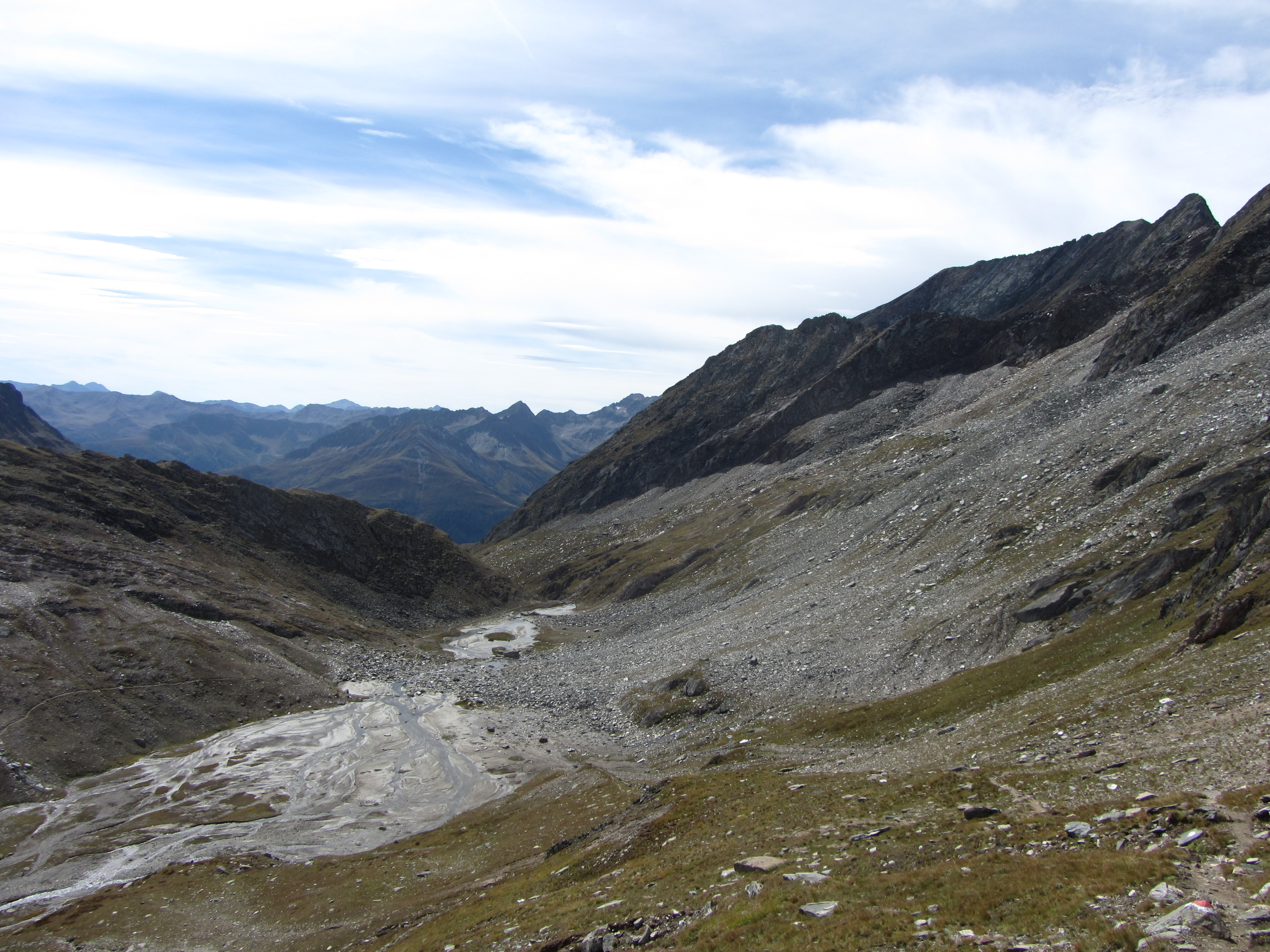 Het Timmeltal vanaf het terras van de Eisseehütte Vanaf de hut verder naar de Wallhorntörl Bij het eerste modderige meertje linksaf en dan gestaag verder omhoog Het modderige meertje vanaf de andere kant Doorkijkje naar de Eissee Een volgend meertje en er groeit alleen nog maar wat mos Steeds kaler en de Steinmann op de Wallhorntörl werd zichtbaar