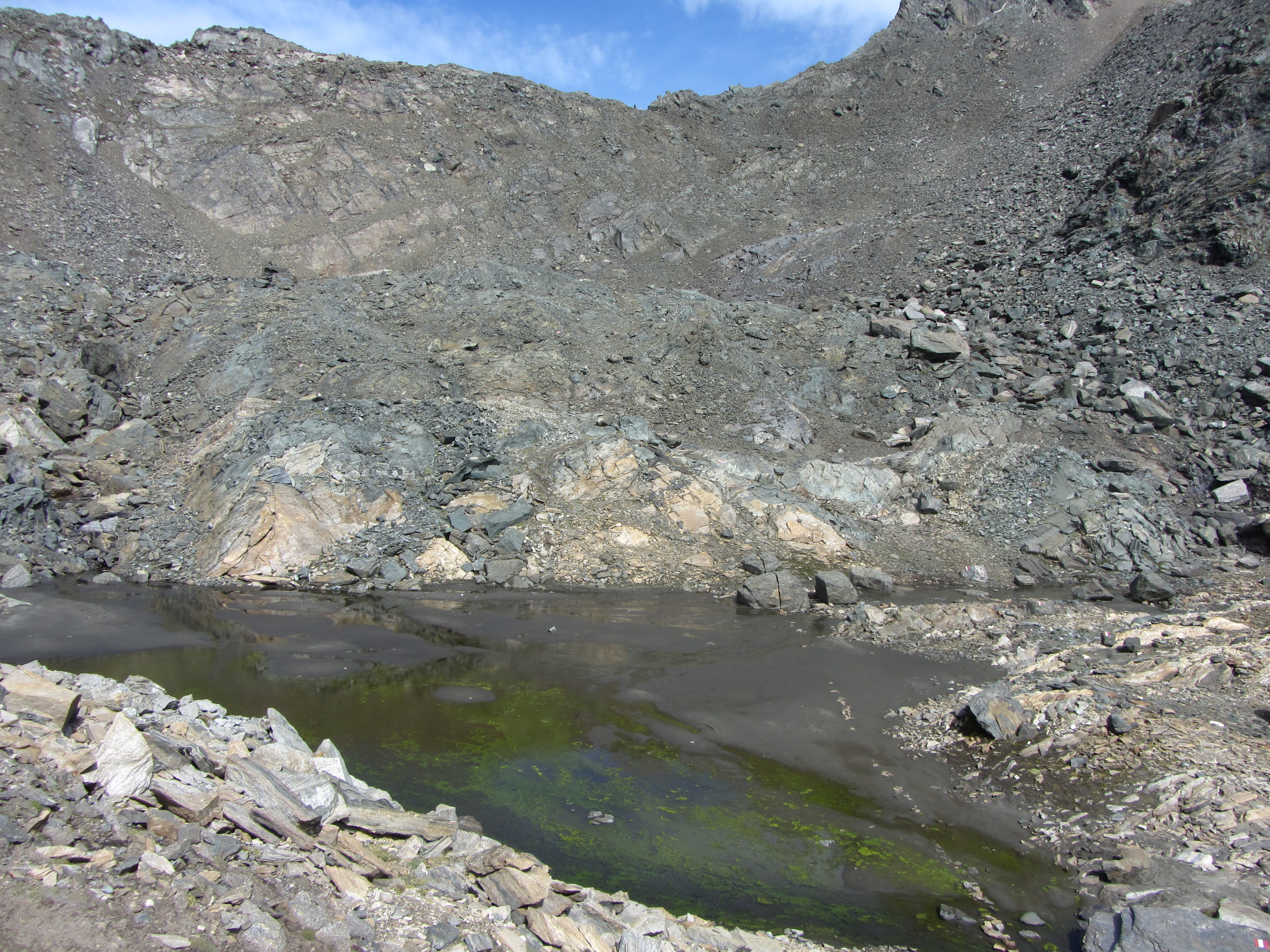 Doorkijkje naar de Eissee Een volgend meertje en er groeit alleen nog maar wat mos Steeds kaler en de Steinmann op de Wallhorntörl werd zichtbaar Nog een meertje met vieze groene algen Groen en slijmerig en voor de kleurcompensatie wat paarse rotsen Het laatste meertje voor de Törl, en zowaar nog iemand anders gespot Bij de Steinmann op de Törl met de verdere route richting Weißspitze