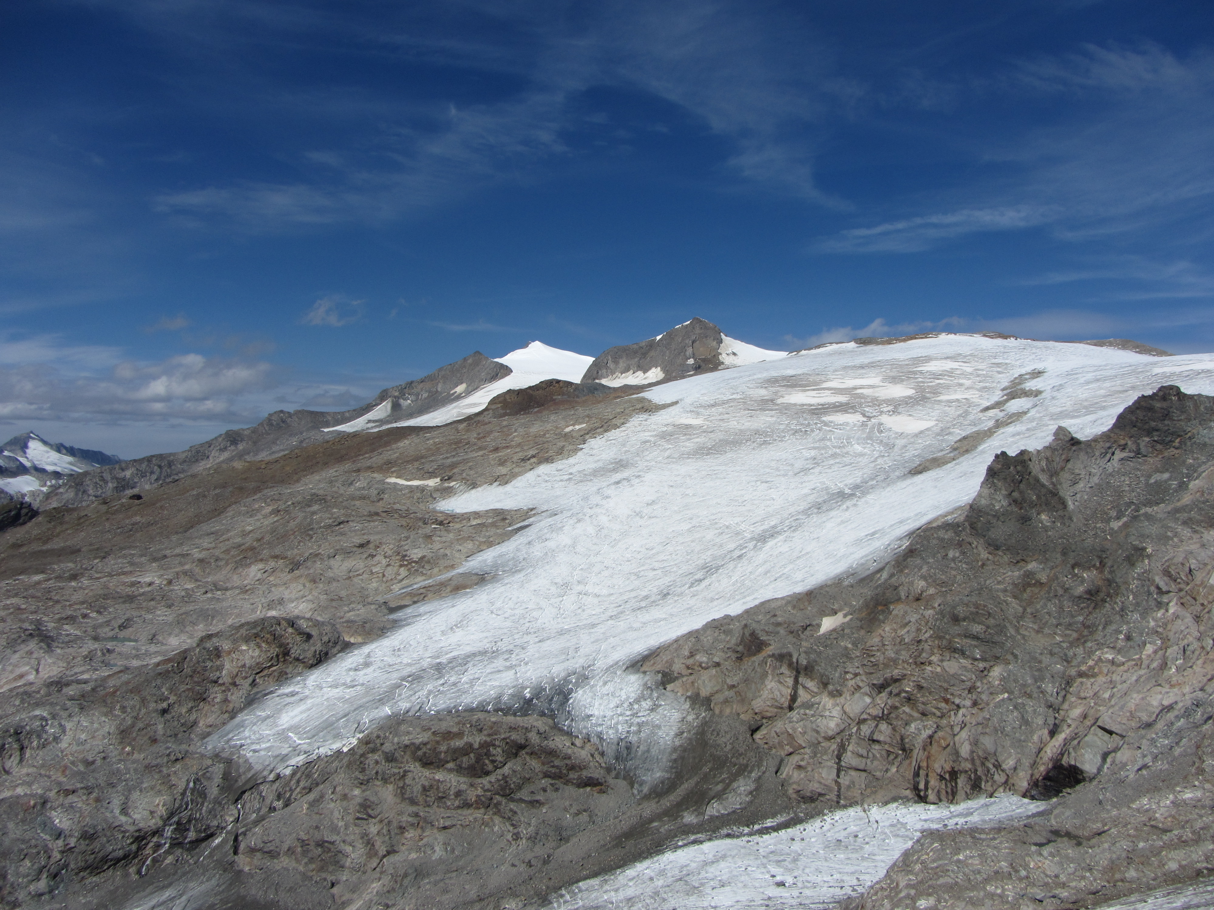 Het laatste meertje voor de Törl, en zowaar nog iemand anders gespot Bij de Steinmann op de Törl met de verdere route richting Weißspitze En op de Törl natuurlijk uitzicht over de rand de andere kant op Uitzicht richting de gletsjers van de Groß Venediger En wat meer rechts om het hoekje Terugblik naar de meertjes Even schrikken om te zien hoeveel minder ijs er ligt vergeleken met 2021
