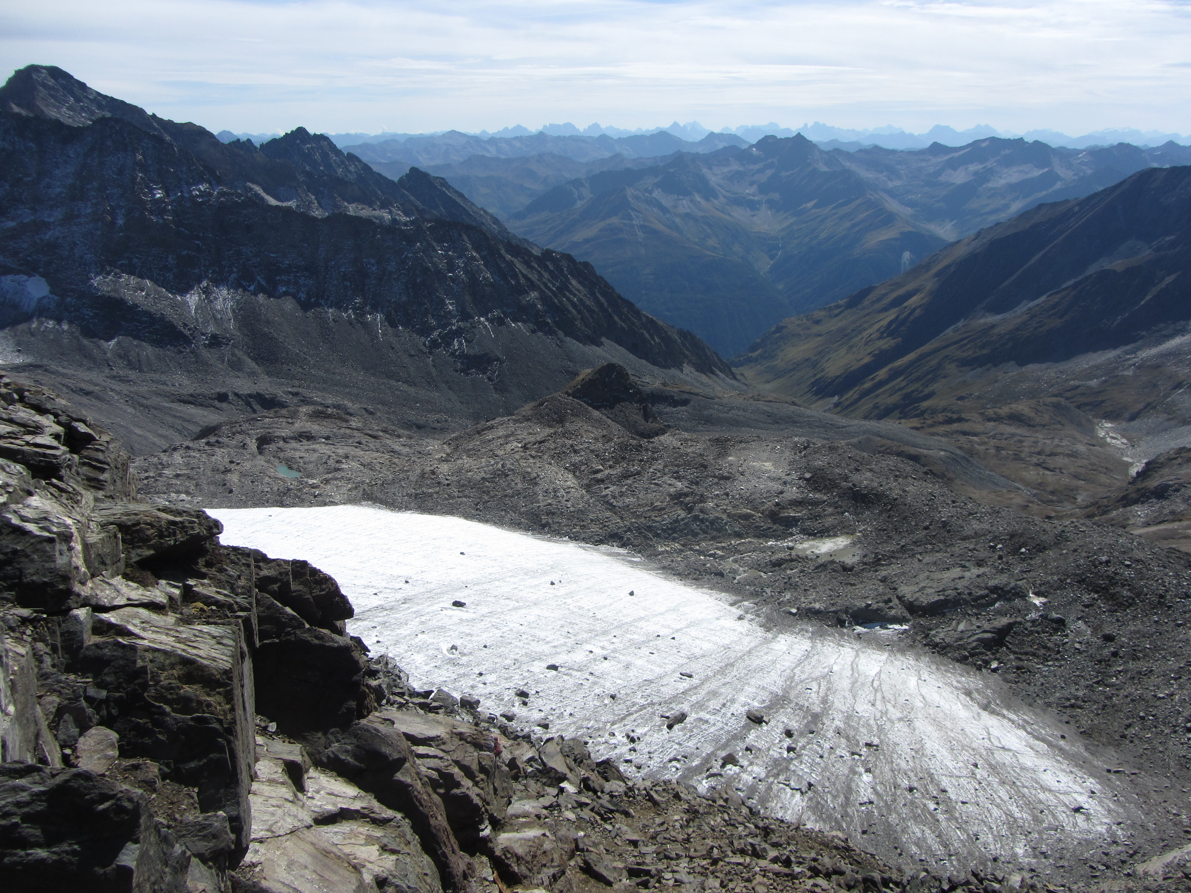 Het pad ging boven de gletsjer langs Deze 30m zandpad was het lastigste stuk Het laatste stukje was leuk rotsenklauteren De Garaneberkees van bovenaf Bijna bij de top met twee Gipfelkreuzen en een Steinmann Achter het kleine Gipfelkreuz was natuurlijk ook weer de Groß Glockner te zien Uitzicht naar het zuidwesten