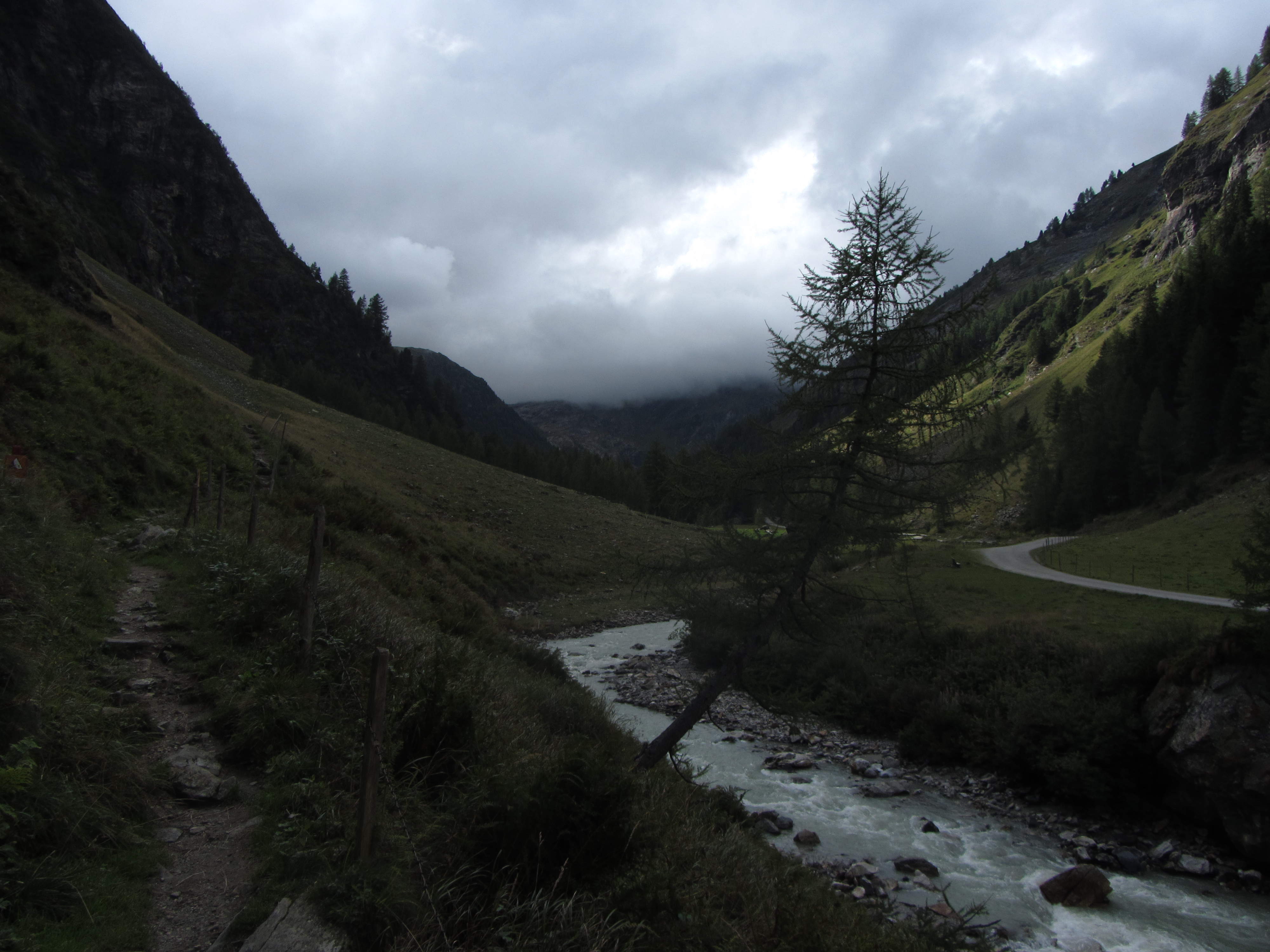 Andere kant van de tunnel was het wat lichter Even de benen strekken door het Gschloßtal Wilde beesten veilig achter een stevig hek (en enthousiaste leren riem voor zo'n klein belletje) Het ansichtkaarten-uitzicht viel een beetje tegen door de wolken Op de terugweg ging het nog hard regenen ook Gästehaus Post in de ochtendzon. Dit jaar de kamer links op de hoek op de tweede verdieping (die met het openstaande klapkantelraam) Naar de Essener-u. Rostocker Hütte en de Rostocker Eck