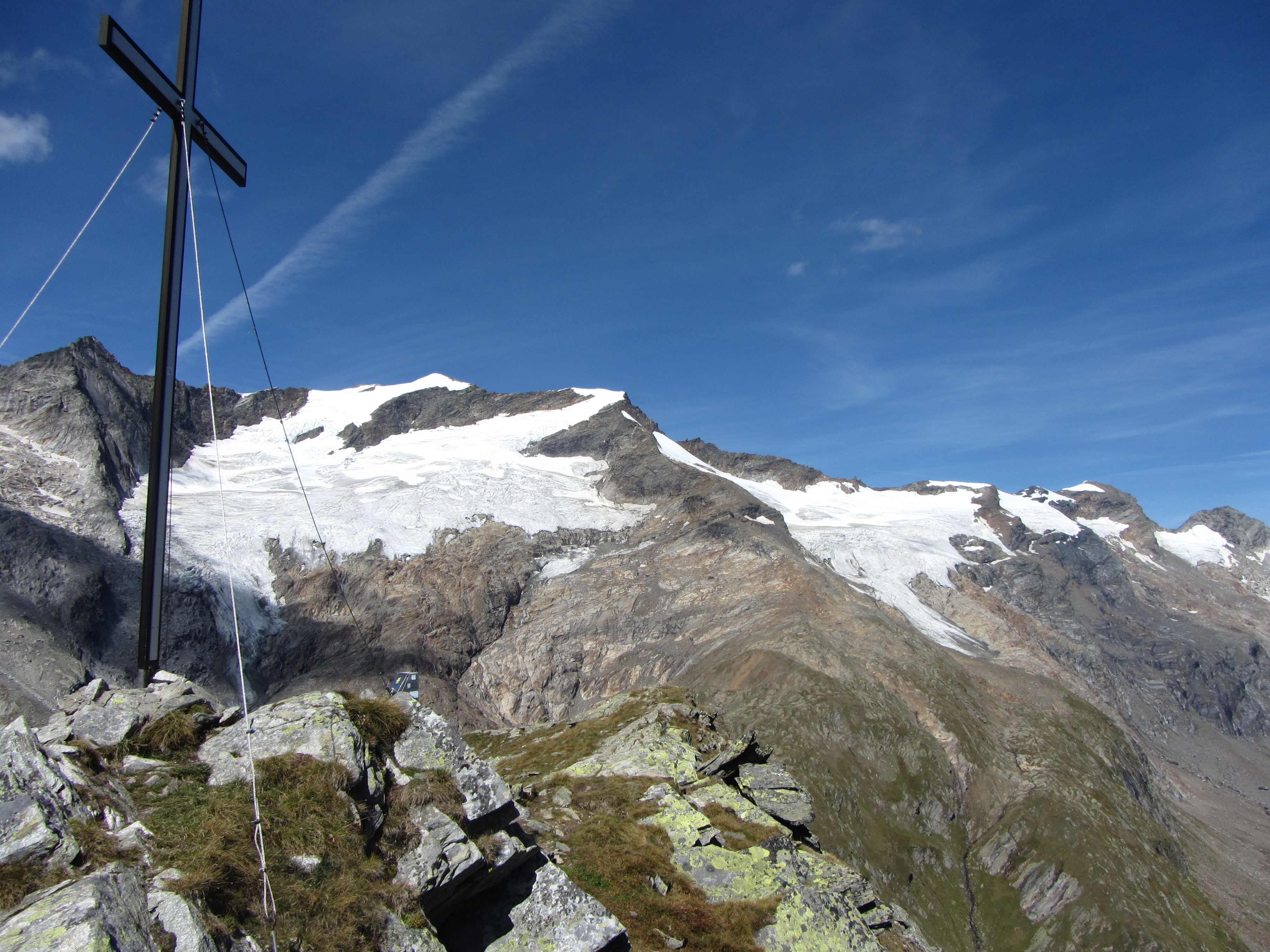 Hier zijn ze wat beter te zien De Malhamkees kwam ook in beeld, achter een rotsige wand Naar het oosten toe kwamen nog wat vers besneeuwde toppen tevoorschijn Op de top Richting noorden. De Groß Venediger blijft verstopt achter de Großer Happ. Het pad door het dal naar de hut was goed te zien Richting zuidoosten. Het Virgental ligt in de diepte.