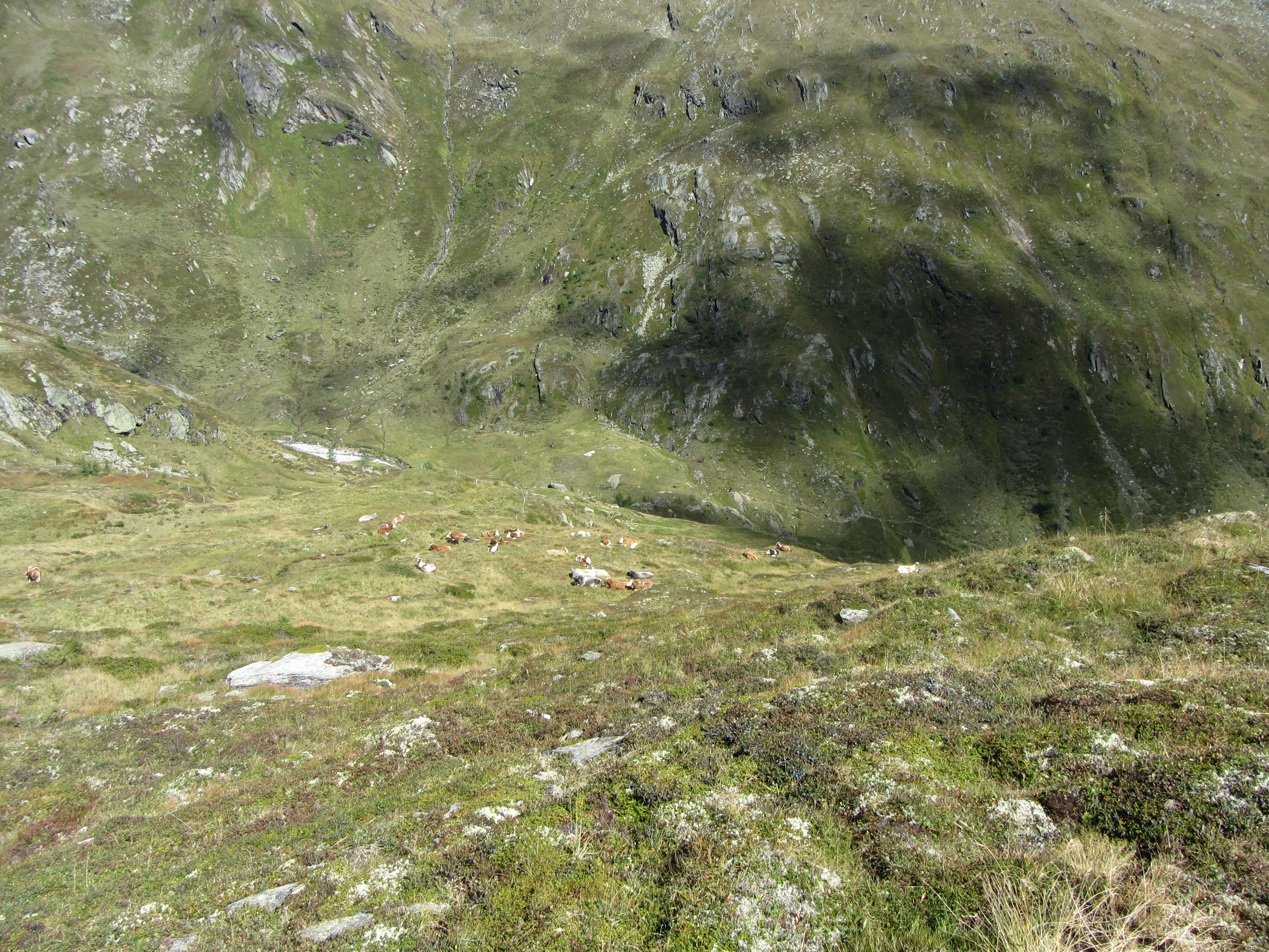 Raar menhirveldje Blauwe bessen-heide. Zag er erg zuur uit dus niet geprobeerd. Weer op ooghoogte met de hut De koeien lagen lekker te liggen in het namiddagzonnetje Naar de Neue Reichenberger Hütte, via het Dabertal De Umbalfälle De splitsing Umbaltal-Dabertal kwam in beeld