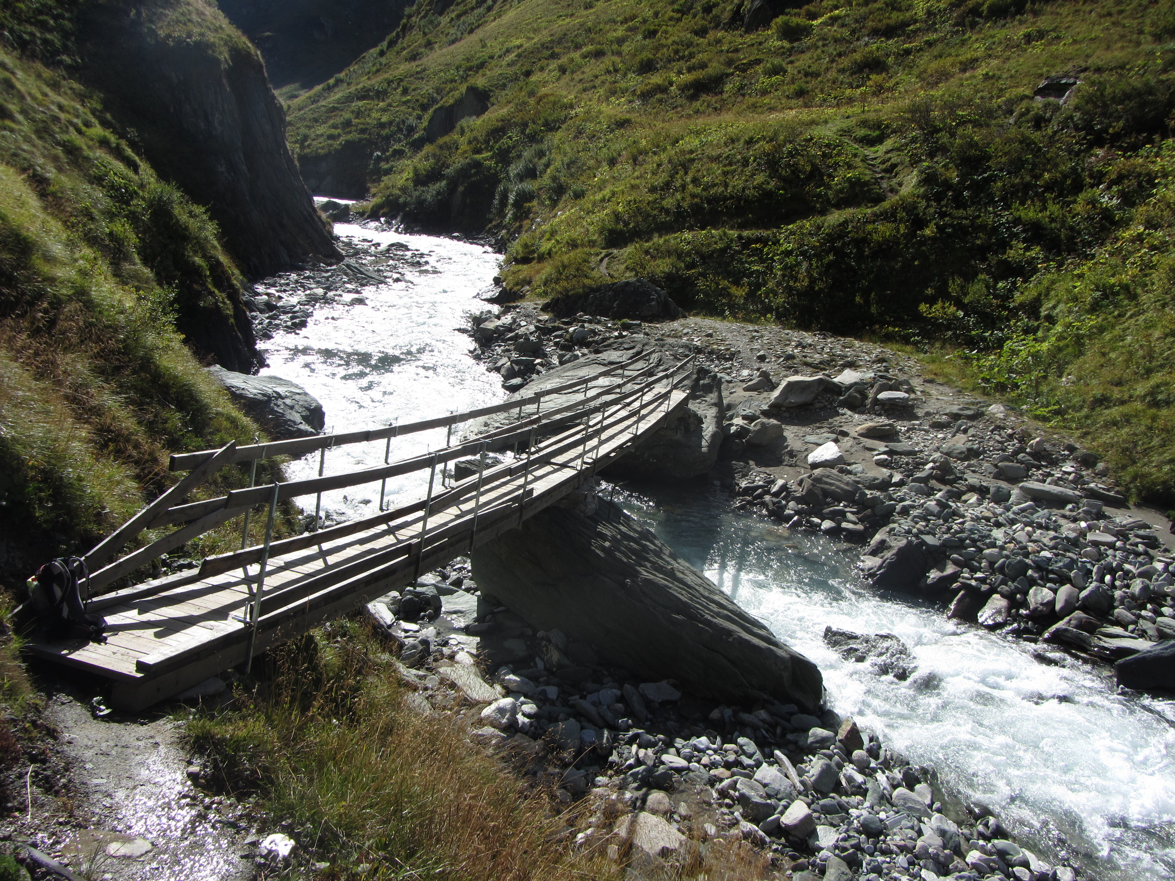 Het gletsjertje bij de top van de Rötspitz wordt steeds zieliger Thou shall not pass (oh ech wel) Het begin van het Dabertal. Het eerste stukje pad slingert flink omhoog. Flinke brug Het Umbaltal en de Clarahütte Laatste blik in het Umbaltal Het Dabertal lag nog deels in de schaduw