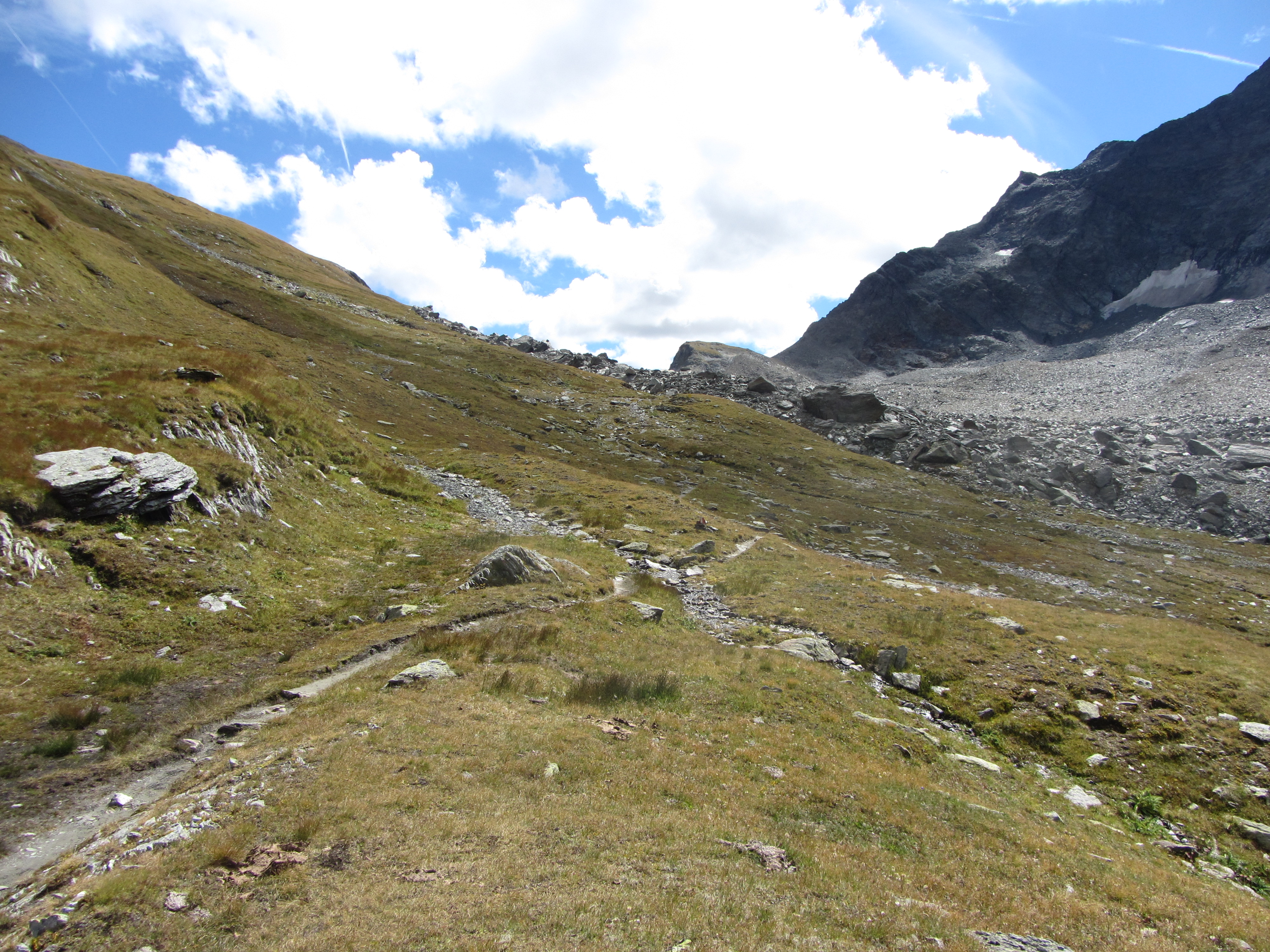 Terugblik door het Dabertal Het pad ging langzaam linksaf en de wereld werd steeds kaler Die ene had de verkeerde dresscode gekregen Richting Daberlenke ging het nog maar een beetje op en neer Blik terug de andere kant op De Keeseck en een meertje zonder naam. Vanwege de waterscheiding van de Daberlenke stroomde er hier nauwelijk water en was het helemaal 100% stil Het pad ging voor de gein links langs dat grote rotsblok