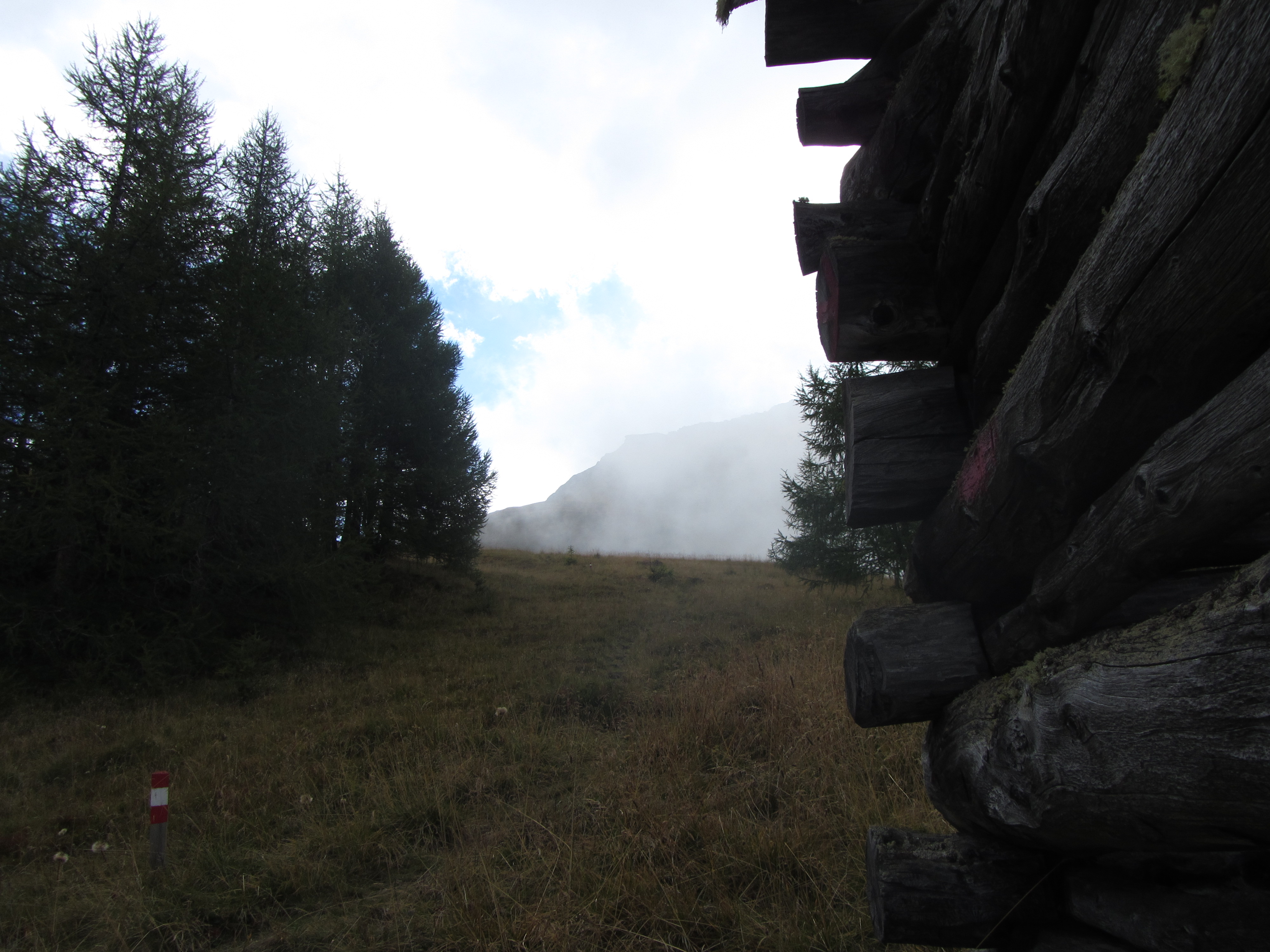Bijna in de wolken Sommige planten konden eigenlijk wel wat water gebruiken Bijna bij de boomgrens en nu zijn er ook wolken beneden te zien Vanaf het schuilhutje bij de bosrand richting Berger Kogel Even later was de Berger Kogel helemaal niet meer te zien Keuzemoment bij het Wetterkreuz. Toch maar niet richting Berger Kogel maar naar de Bergerseehütte Goede keuze; een paar minuten later vielen er wat druppels