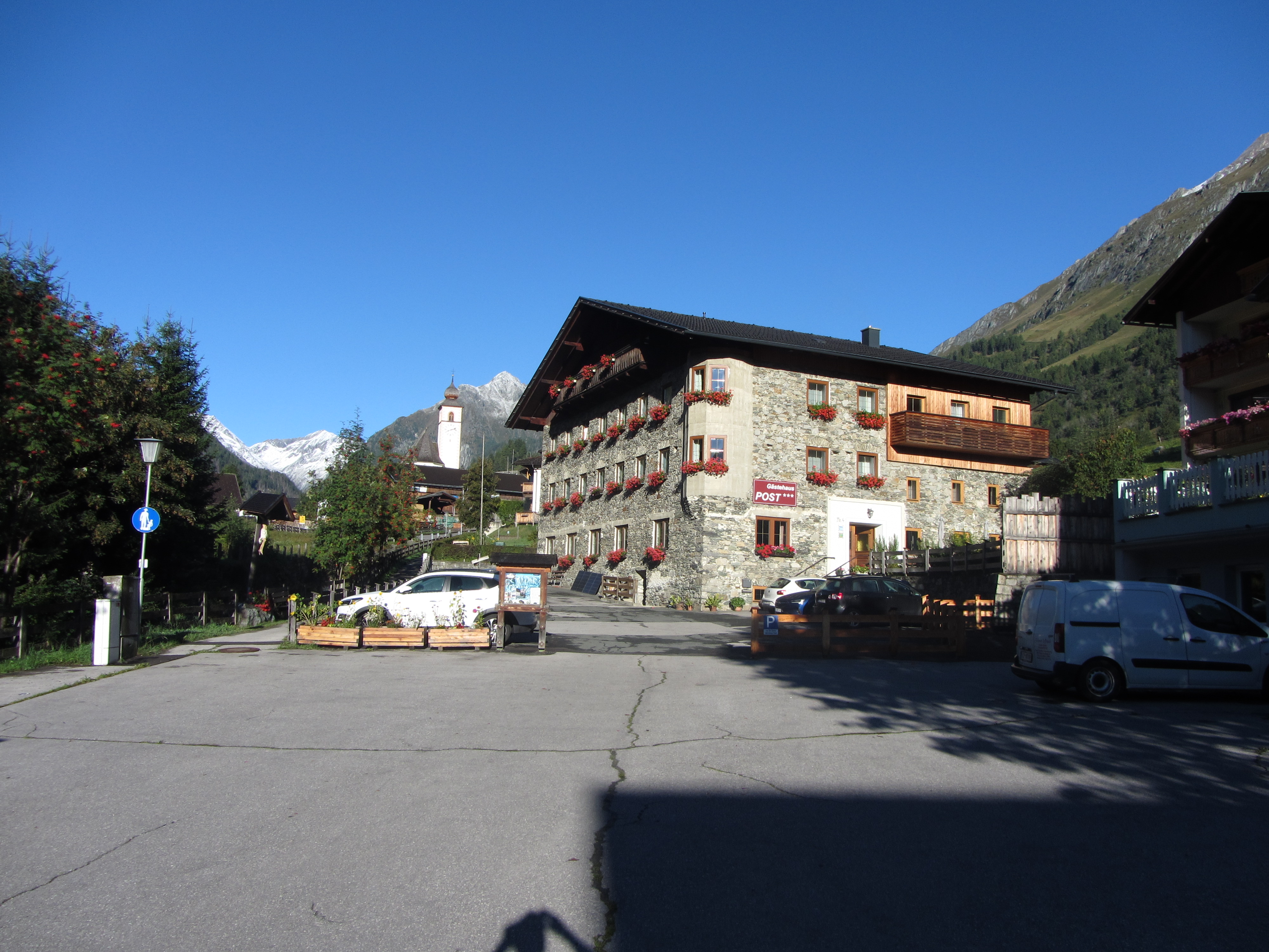 Eind van de middag verdween de Berger Kogel helemaal in een dikke onweersbui Er was zelfs verse sneeuw gevallen op de bergen achter het Gästehaus Foto door de Muhs webcam van de volgende ochtend Verse sneeuw vanaf 2300m Hele vroege paraglider Via de Wunalm naar de Bonn Matreier Hütte en de Rauhkopf Vanaf Parkplatz Bodenalm uitzicht richting Lasörlinggruppe