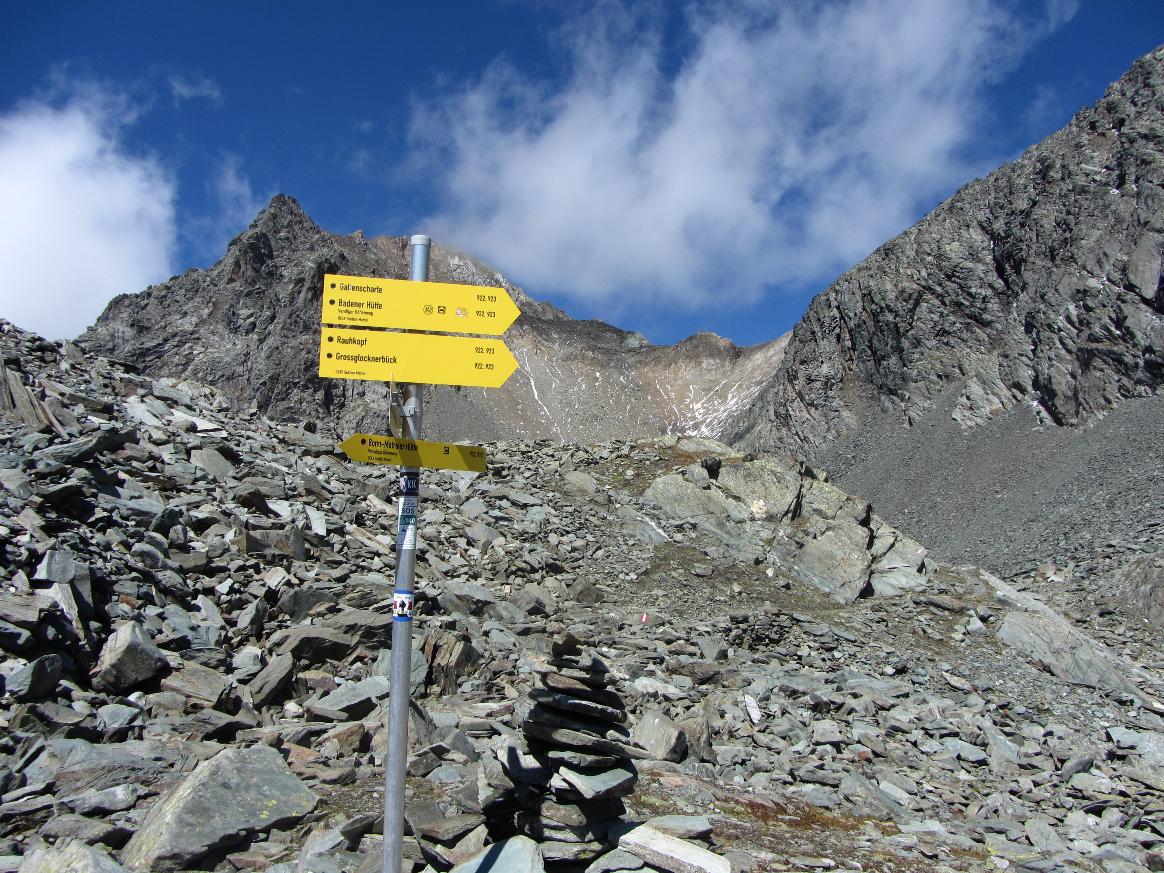 Terugkijkend was het steile zigzagstukje mooi te zien Bij de Bonn Matreier Hütte De Rauhkopf en het pad over de graat incl mensen Ze zijn niet heel creatief met wegnummers Er lagen wat steentjes op het pad Die kant op dus Opeens dook de Groß Glockner op