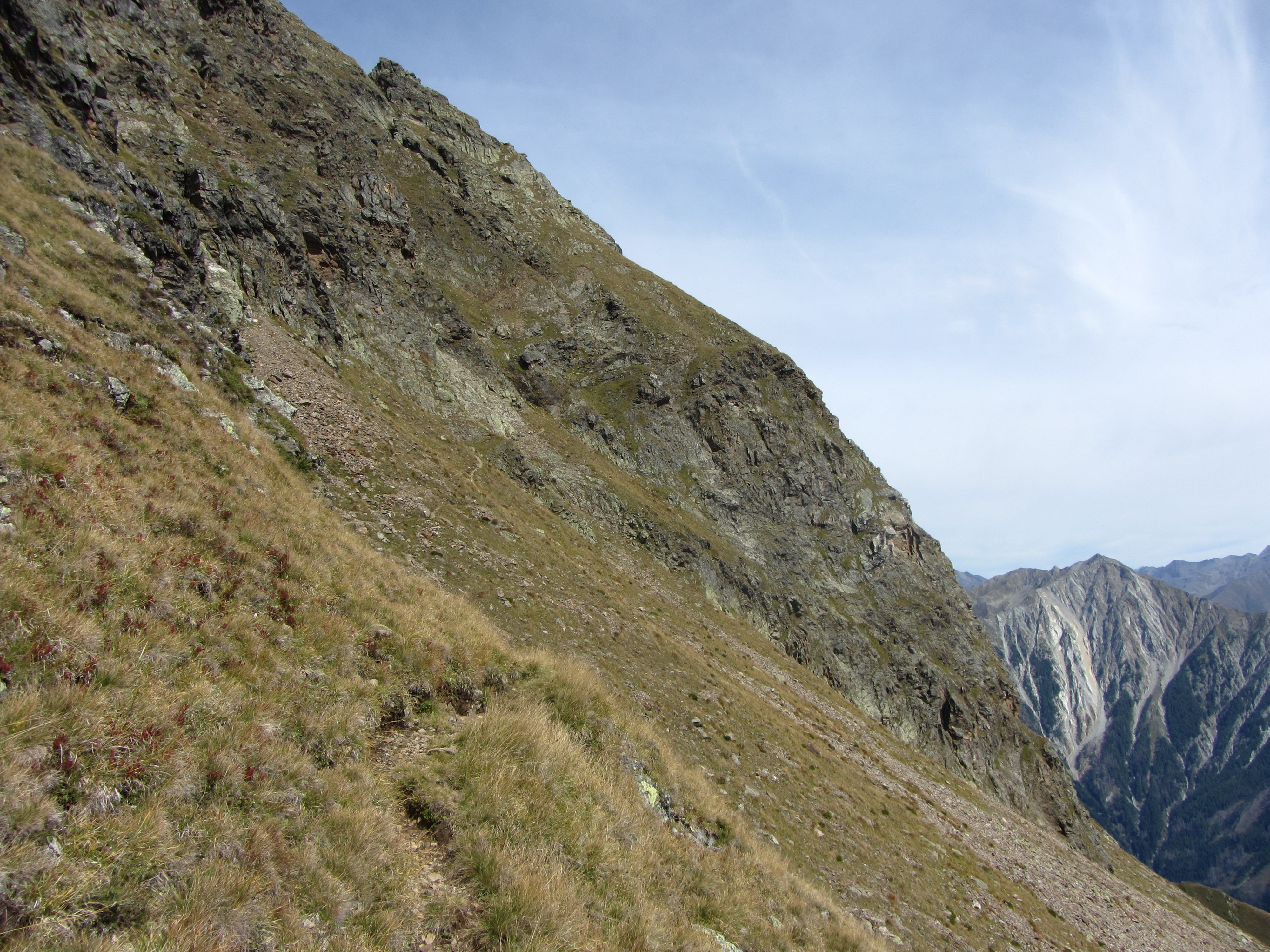 Vanaf de Törl natuurlijk ook opeens uitzicht de andere kant op, richting Lienz Op de Rottörl. Rechts het Arnitztal, links het Feglitztal Vlak na de Törl keuze voor het pad door de zuidoostwand van de Zunig of wat meer door het dal Telkens weer een nieuw hoekje om Het pad was vrij vlak en niet echt moeilijk, maar wel flink wat stukken met een staalkabel voor mensen met hoogtevrees Als je heeeeel goed keek kon je het topje van het Gipfelkreuz zien Kiekeboe Groß Glockner