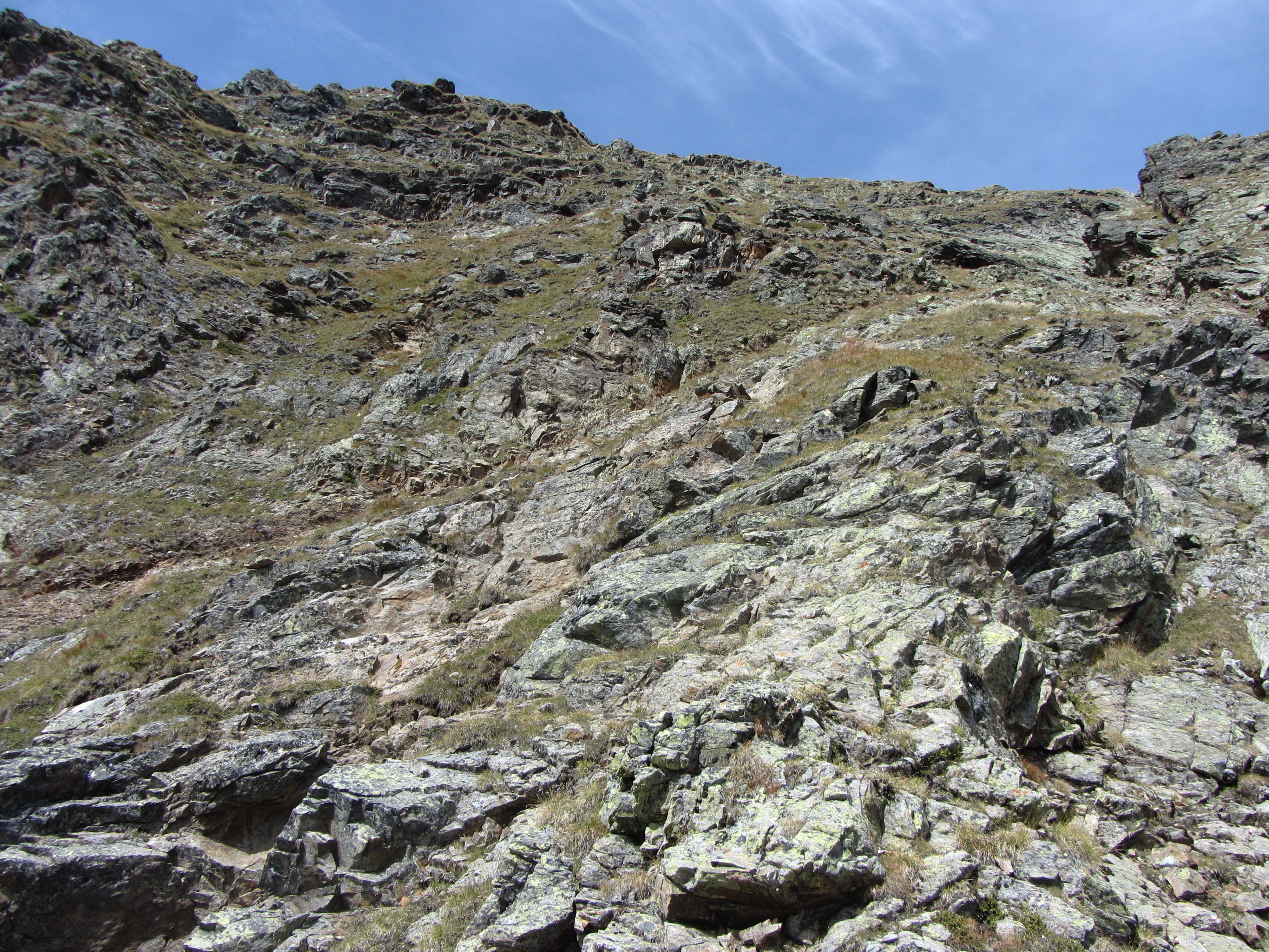 Vlak na de Törl keuze voor het pad door de zuidoostwand van de Zunig of wat meer door het dal Telkens weer een nieuw hoekje om Het pad was vrij vlak en niet echt moeilijk, maar wel flink wat stukken met een staalkabel voor mensen met hoogtevrees Als je heeeeel goed keek kon je het topje van het Gipfelkreuz zien Kiekeboe Groß Glockner Het laatste stukje tot de splitsingwegwijzer was een groot stenenfeest maar wel vrijwel helemaal vlak De weg vanaf het Rottörl