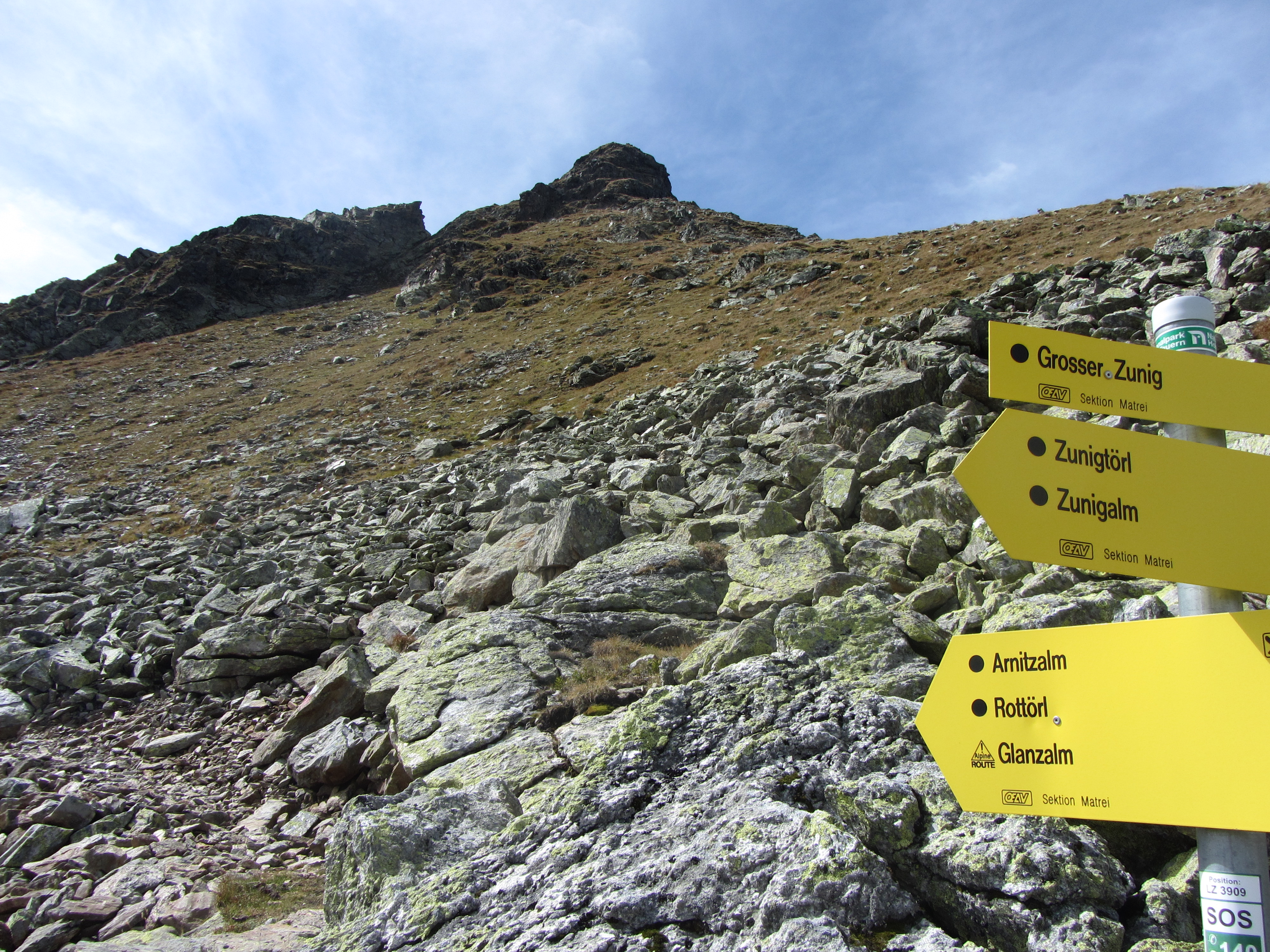 Kiekeboe Groß Glockner Het laatste stukje tot de splitsingwegwijzer was een groot stenenfeest maar wel vrijwel helemaal vlak De weg vanaf het Rottörl De top van de Großer Zunig is nog maar 150m Het pad zigzagde nu weer steil omhoog Ook nu nog een stukje staalkabel voor de Schwindelbeschwerden Het Gipfelkreuz is nu vlakbij