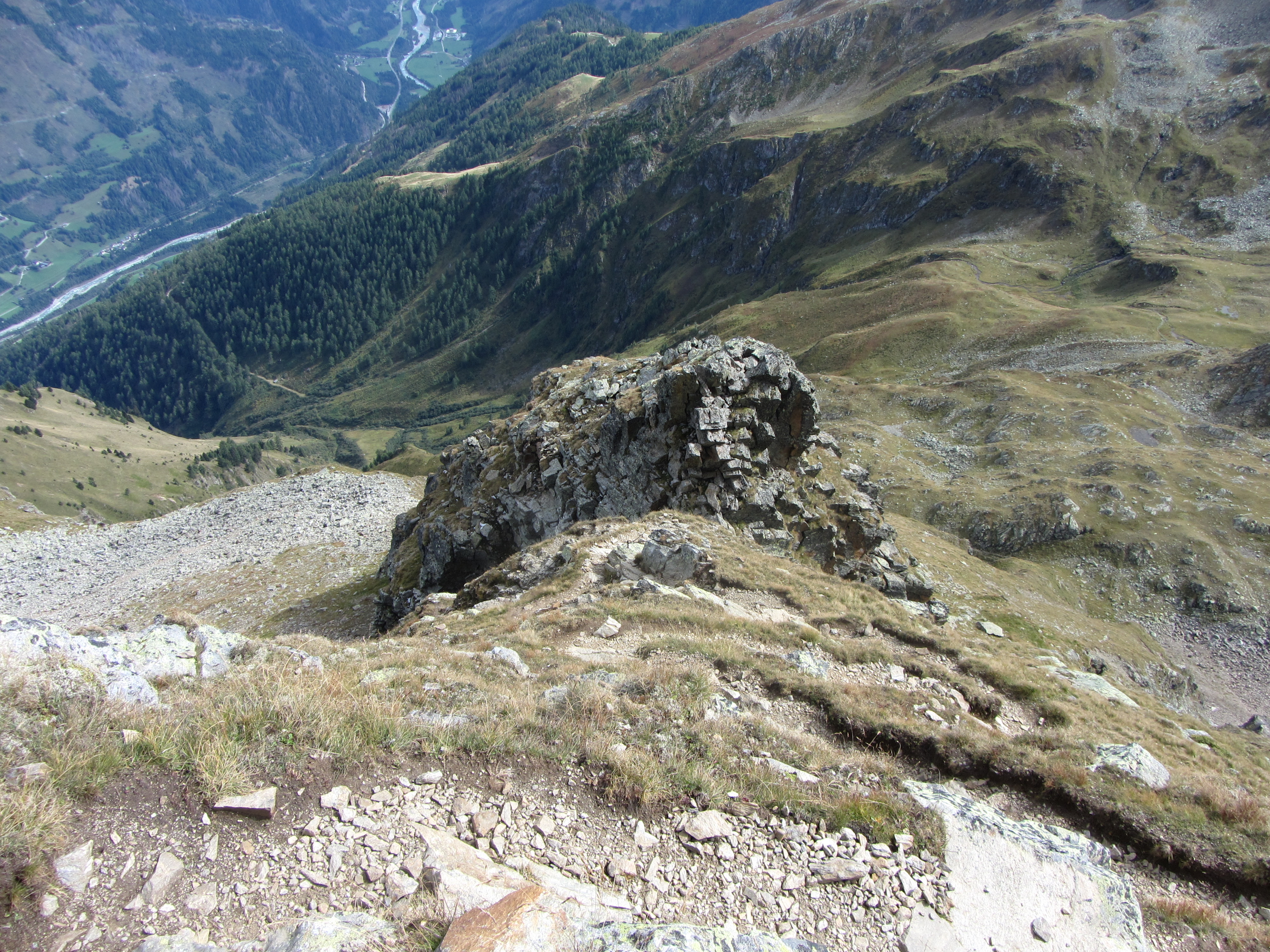 De Groß Glockner Richting Lienz waren zelfs wat bergen uit Slovenië te zien (ruim 100km ver weg) In Italië zijn alle bergen blauw Weer zigzag naar beneden De Zunigtörl en het pad naar de Kleiner Zunig (nu nog beneden). Het afgesplitste dalpad vanaf de Rottörl komt hier weer terug. Vanaf de Zunigtörl is de Kleiner Zunig weer een stukje naar boven De Zunigsee en vlak daarachter de Ganitzle