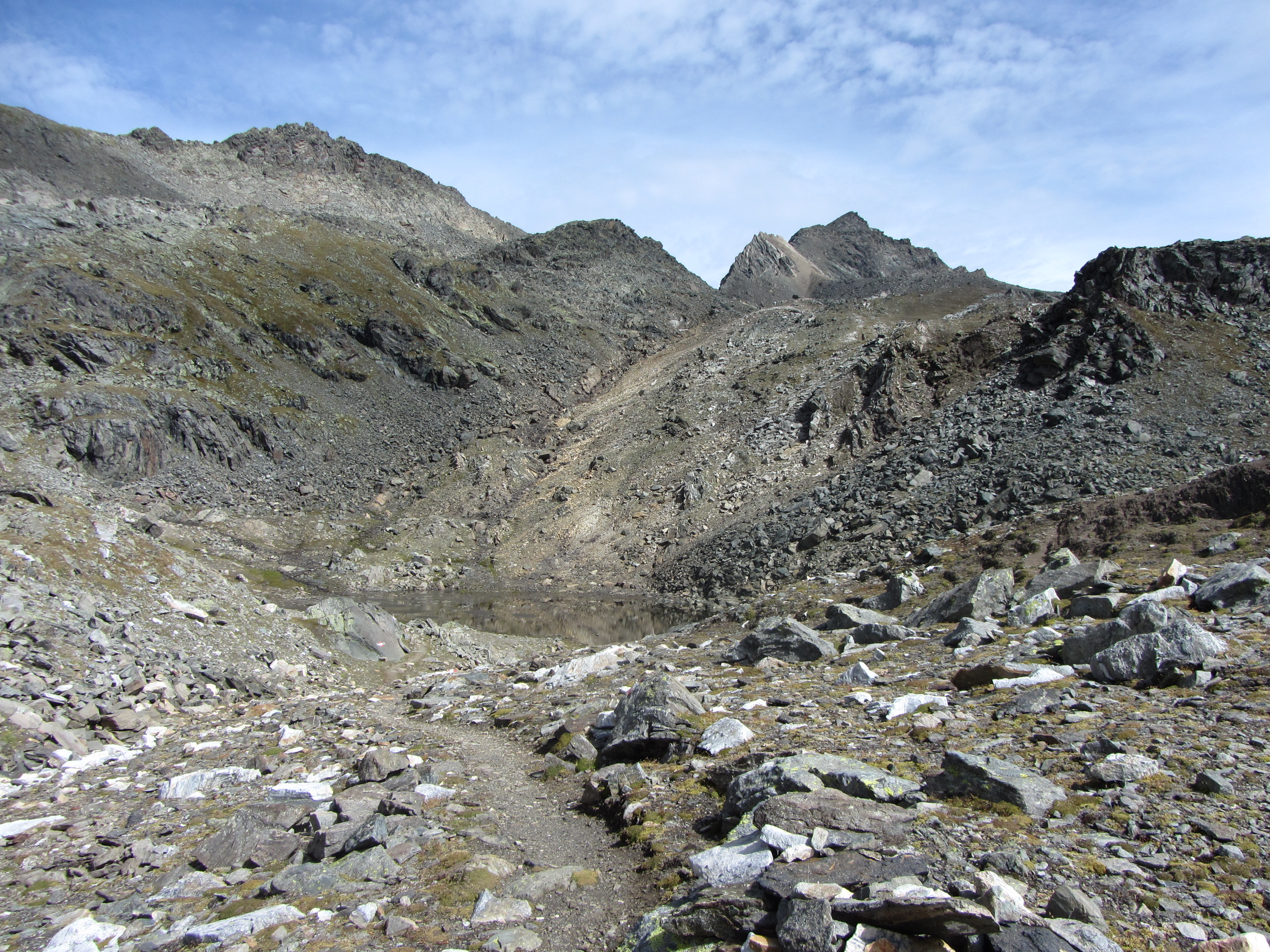 Bij het eerste modderige meertje linksaf en dan gestaag verder omhoog Het modderige meertje vanaf de andere kant Doorkijkje naar de Eissee Een volgend meertje en er groeit alleen nog maar wat mos Steeds kaler en de Steinmann op de Wallhorntörl werd zichtbaar Nog een meertje met vieze groene algen Groen en slijmerig en voor de kleurcompensatie wat paarse rotsen