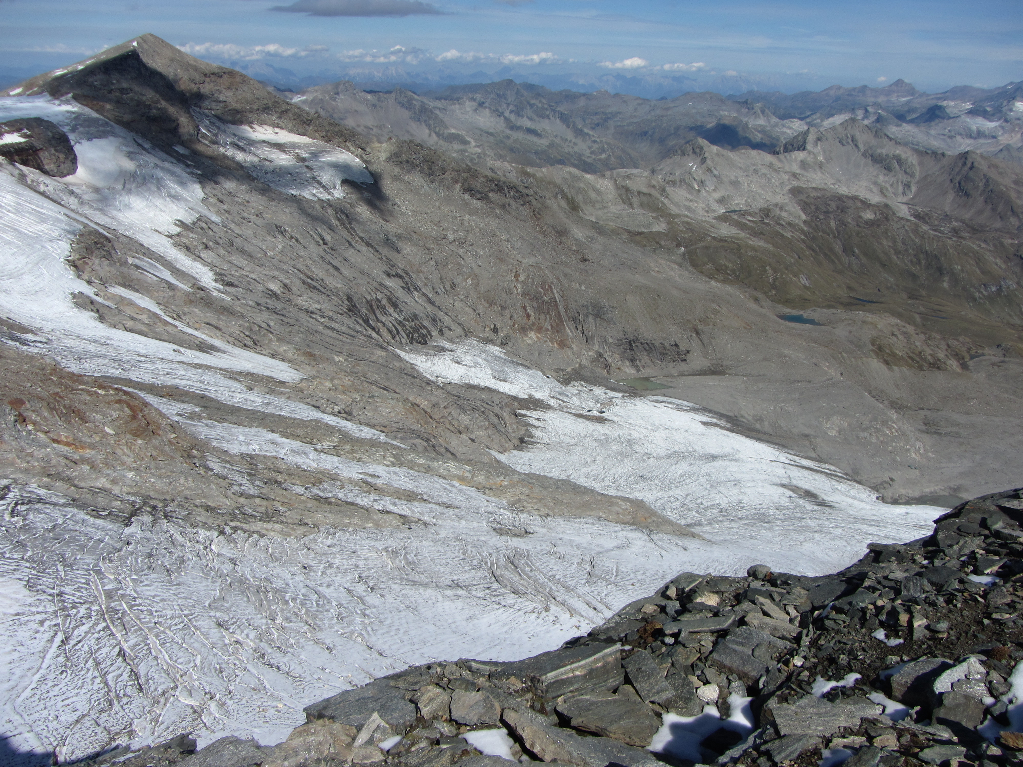 Uitzicht naar het noordwesten De Wilder Kaiser was ook te zien De Wilder Kaiser hier een beetje beter te zien De Frosnitzkees in het lege lege Frosnitztal Uitzicht richting Duitsland Het grote Gipfelkreuz met op de achtergrond de Rötspitz Uitzicht langs de graat helemaal richting Vorderer Sajatkopf
