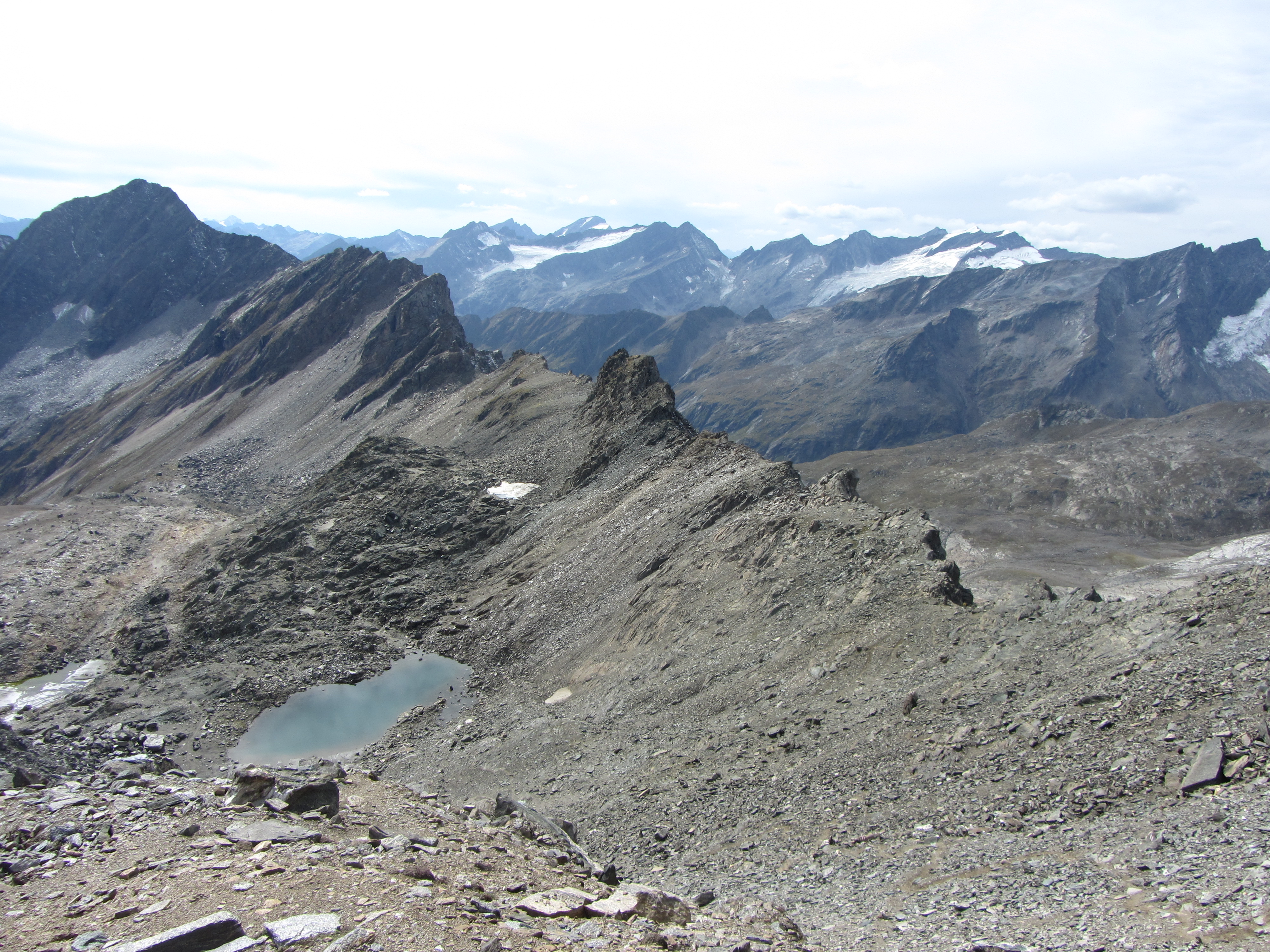 Uitzicht richting Duitsland Het grote Gipfelkreuz met op de achtergrond de Rötspitz Uitzicht langs de graat helemaal richting Vorderer Sajatkopf Stukje omlaag was de Wallhorntörl weer te zien Op de terugweg nog drie mensen gespot Vanaf het modderige meertje nog een terugblik naar de Weißspitze Bijna terug in het Virgental worden de bergen langzaam silhouetten